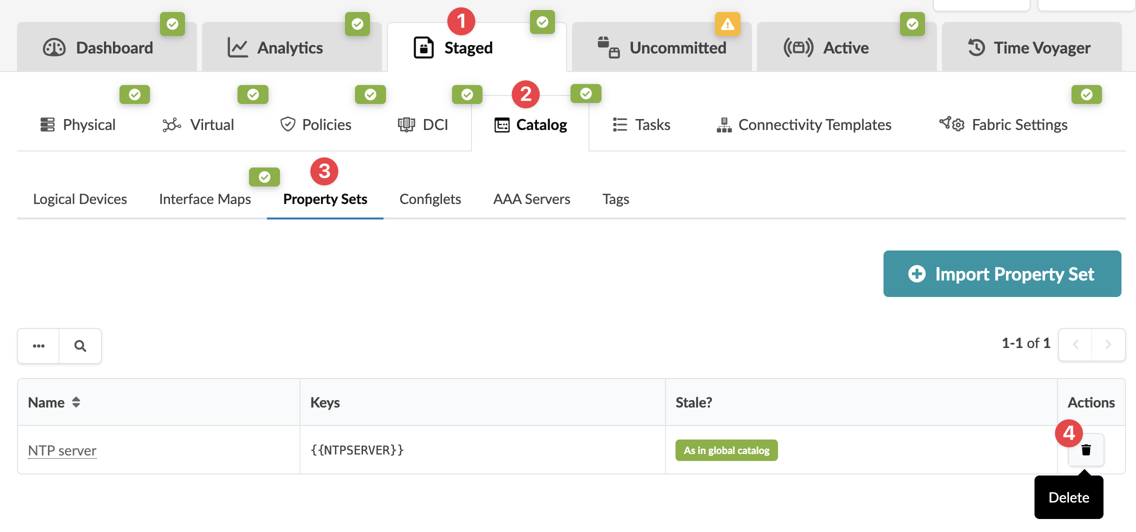 To delete a datacenter blueprint property set from the Apstra GUI: