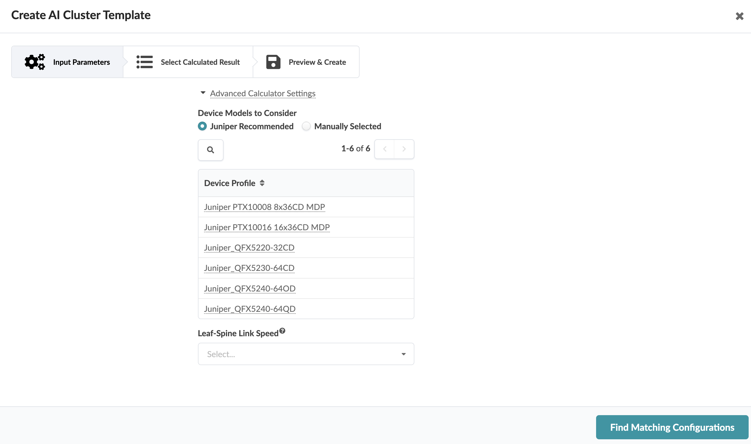 The tables often have many proposals. You can filter the results based on leaf and/or spine logical devices. For example, you may decide to select only leaf logical devices with 400G interfaces excluding those with 200G. Or, you may want to select spines that are fixed-form factors only while excluding those where the port count indicates chassis.