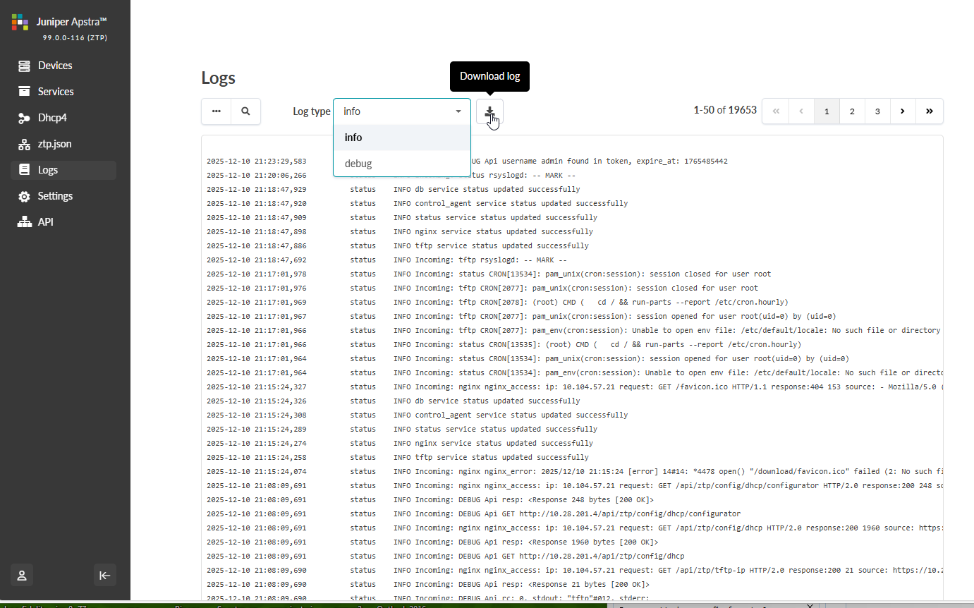 To assist with troubleshooting, you can access various ztp logs directly from the Apstra ZTP GUI (as of Apstra version 5.0.0).