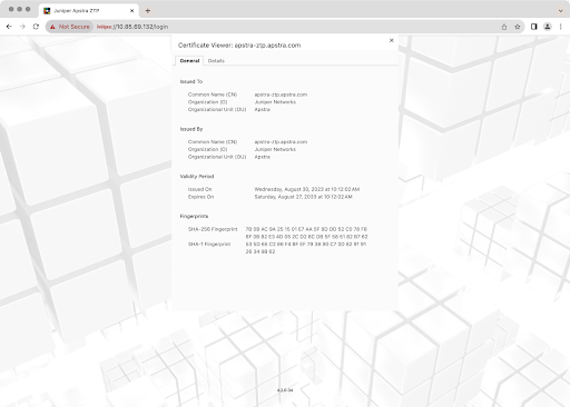 For security, we recommend that you replace the Apstra ZTP default self-signed SSL certificate with one from your own certificate authority. Web server certificate management is the responsibility of the end user. Juniper support is best effort only.