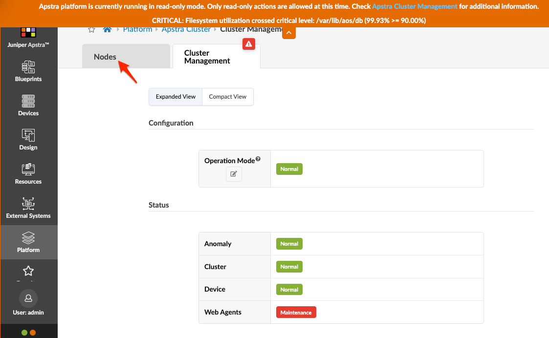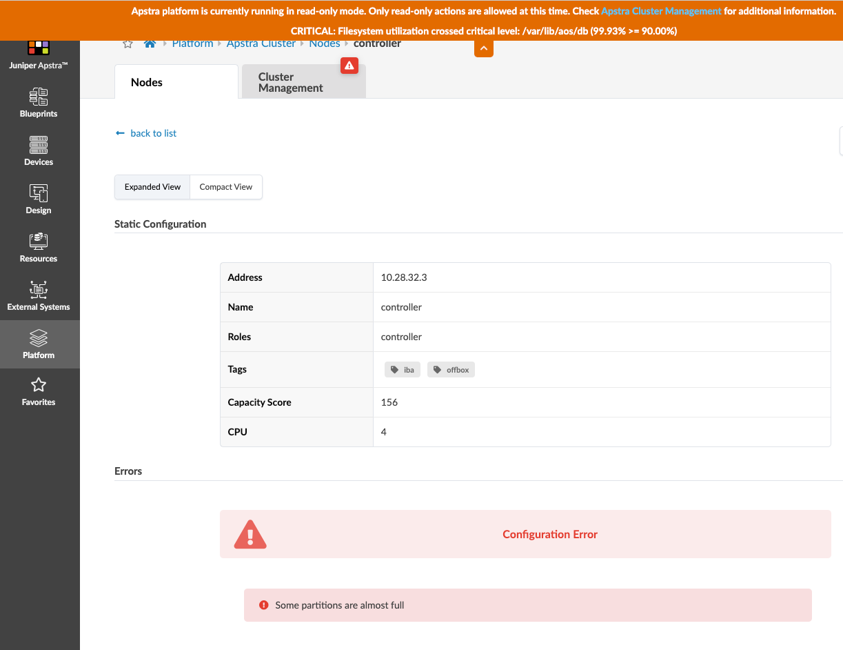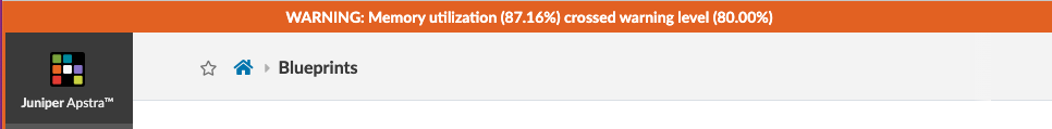 If memory utilization exceeds 90%, a critical message appears at the top of all GUI pages. Before you can make any more changes to the fabric, you must address the shortage by adding disk space to the problematic filesystem(s) or by adding memory, as needed. You can click the link to go to Apstra Cluster Management for more information.