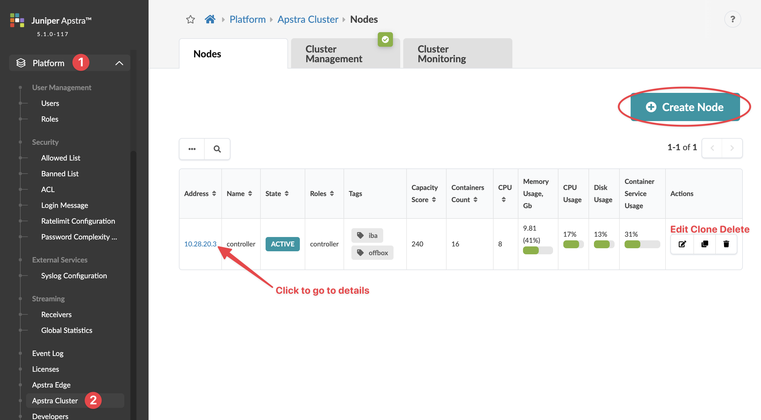 To access the VMs, from the left navigation menu, navigate to Platform > Apstra Cluster. Click a node address to see its details. You can create, clone, edit and delete nodes.