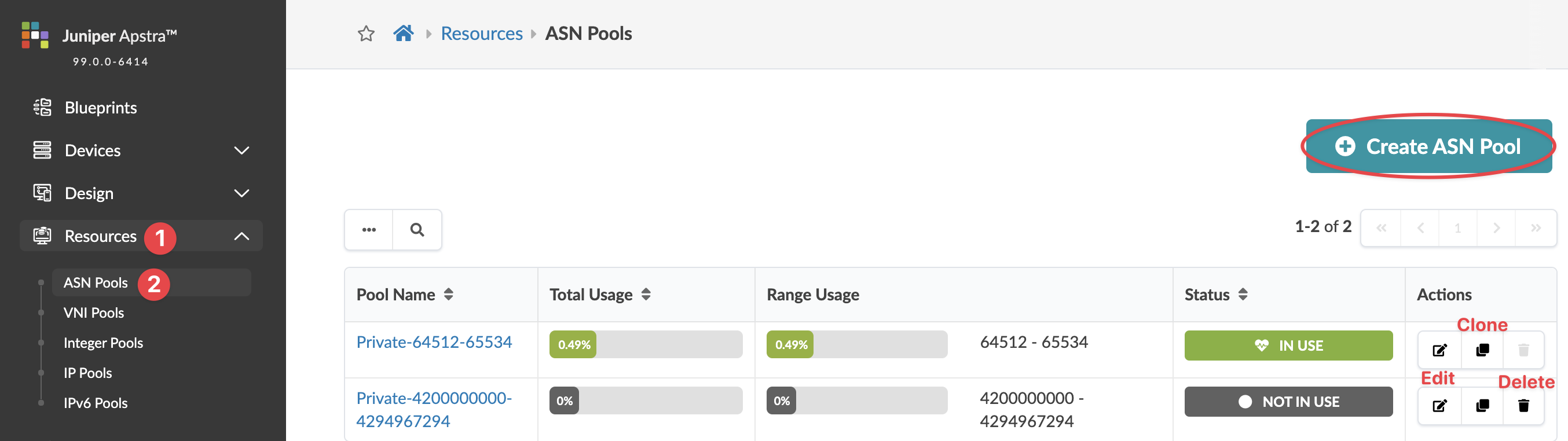From the left navigation menu, navigate to Resources > ASN Pools to go to the ASN Pools page where you can create (clone), update and delete ASN pools.
