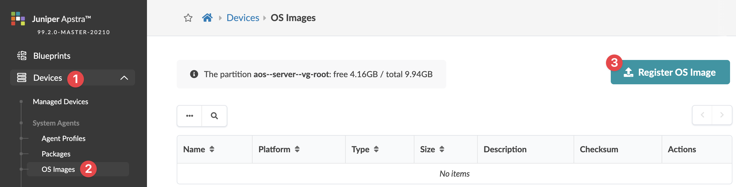 From the left navigation menu, navigate to Devices > System Agents > OS Images and click Register OS Image (top-right).