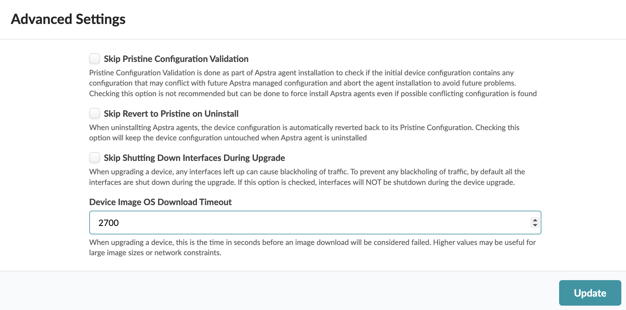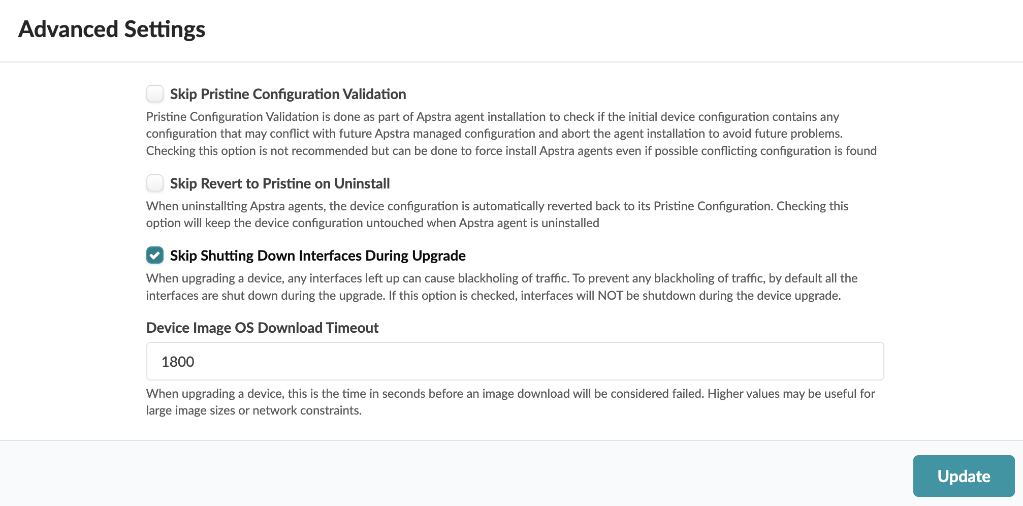 Interfaces remain disabled before the intended configuration is pushed to prevent traffic blackholing. To keep interfaces enabled during upgrade, you can change the default setting as follows: