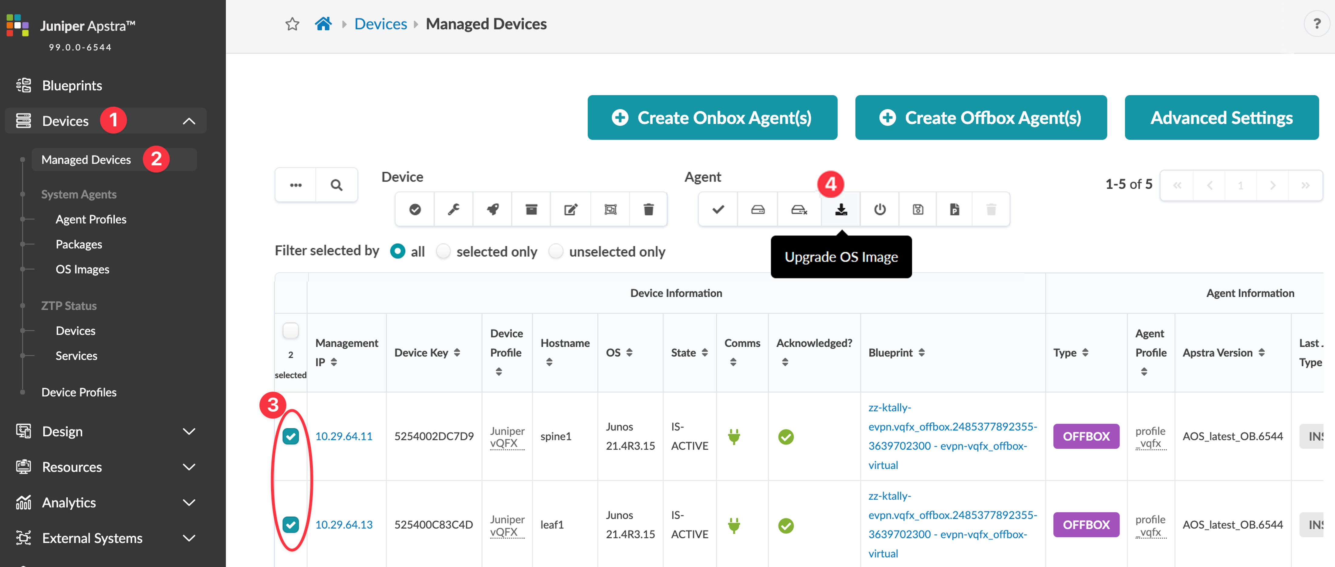 CAUTION:Make sure to select a compatible device operating system image for the device that you're upgrading. If you use an incompatible image and the upgrade fails, the deployment lock is not released automatically, even if you recover the device. To release the deployment lock and activate the device again, remove the device assignment from the blueprint, decommission and normalize the device (from Devices > Managed Devices), then reassign the device to the blueprint. For assistance, contact Juniper Support.