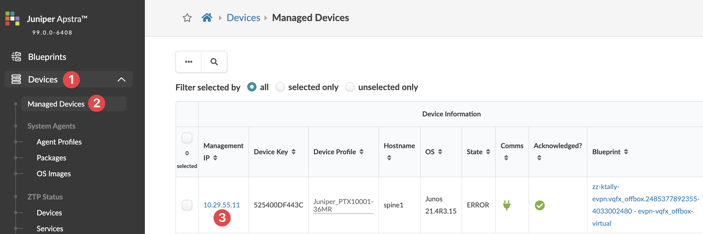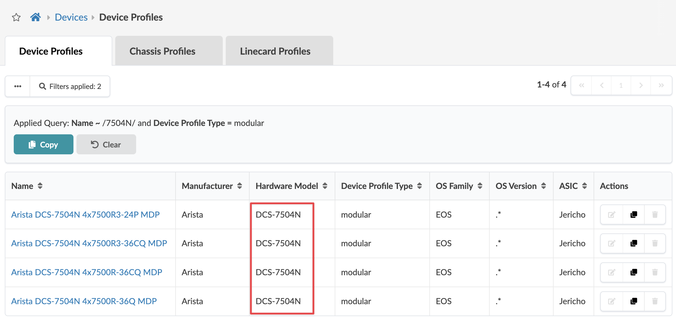 The first device profile that matches the device chassis model (based on the selector model field) is associated with the device (DCS-7504N for example). If you're using a modular device in your network, check that the correct device profile is associated with it. If it's not, change its device profile to the correct one before acknowledging the device and assigning it to a blueprint.