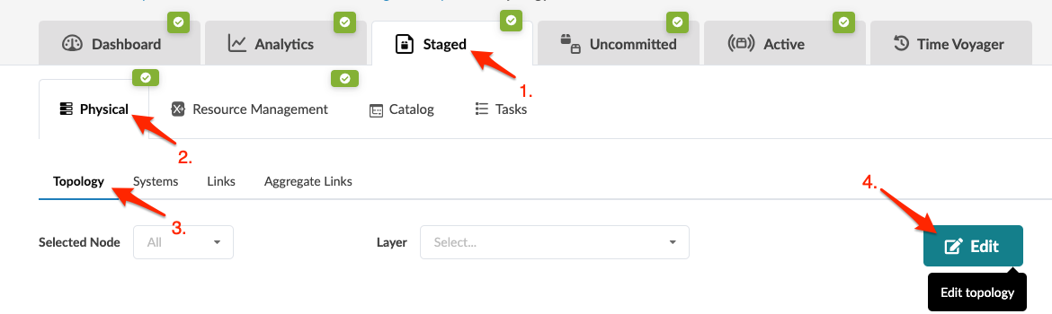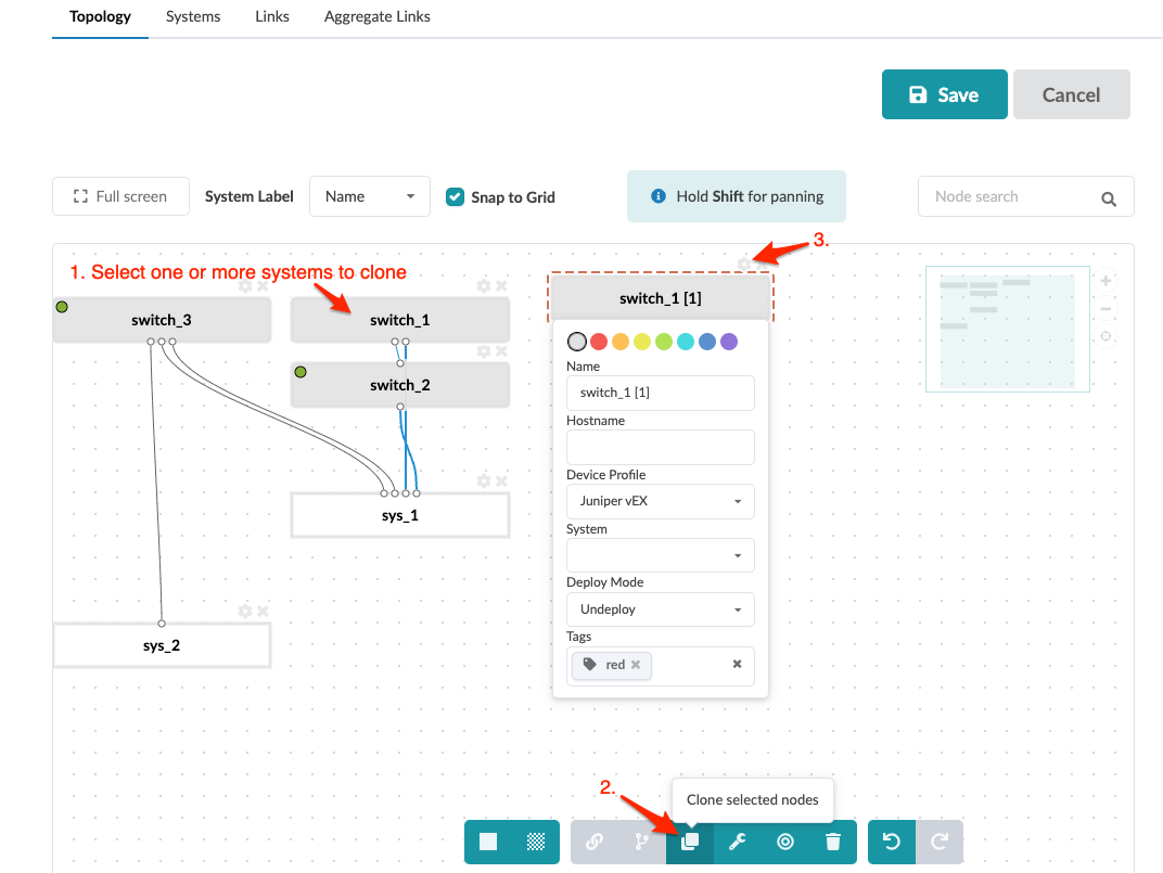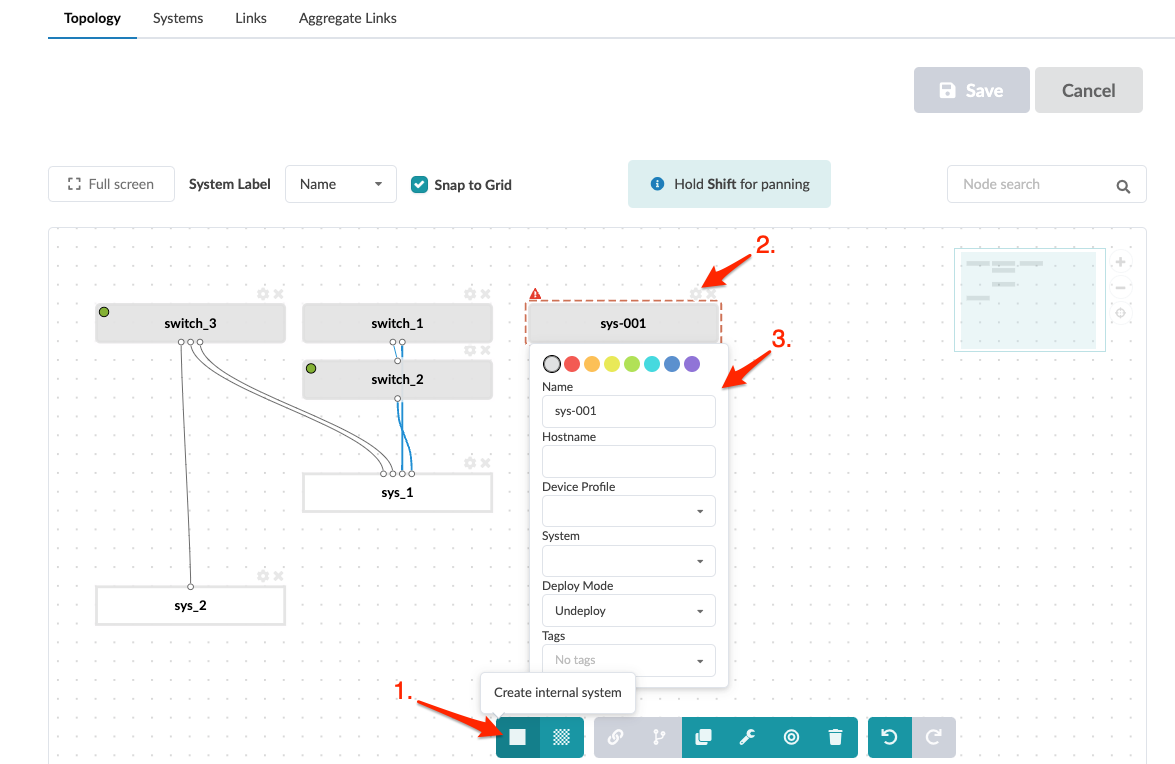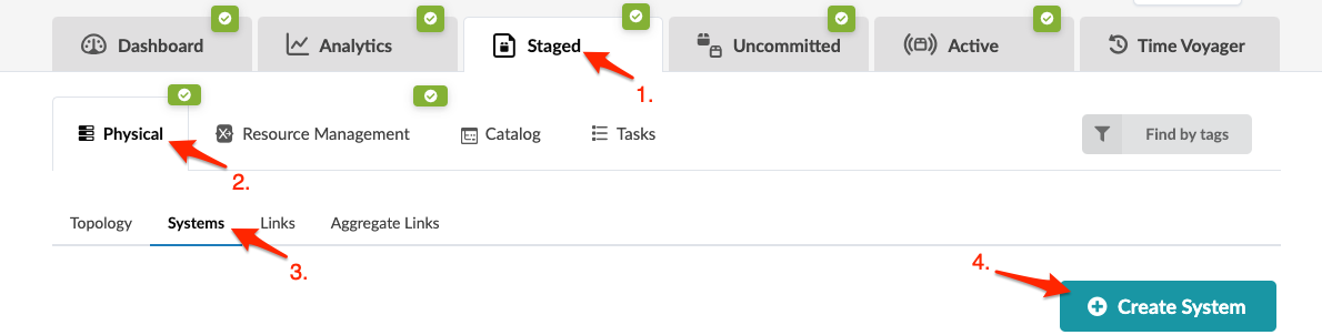 Systems represent switches, routers, Linux hosts and so on. Managed devices that you add to a blueprint are called internal systems. You can create systems from scratch, or you can clone systems and customize them to create new ones. You can create (and clone) from the Topology view or from the Systems view.