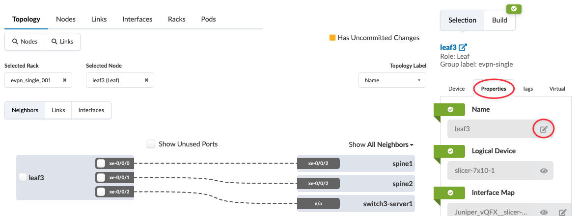 To change the hostname and/or name on one leaf device using the GUI: