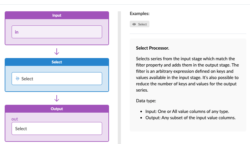 The Select Processor functions like a filter in the IBA probe processing pipeline. It can be applied to a stage, which contains a huge dataset, in order to narrow down it down into a subset of that data.