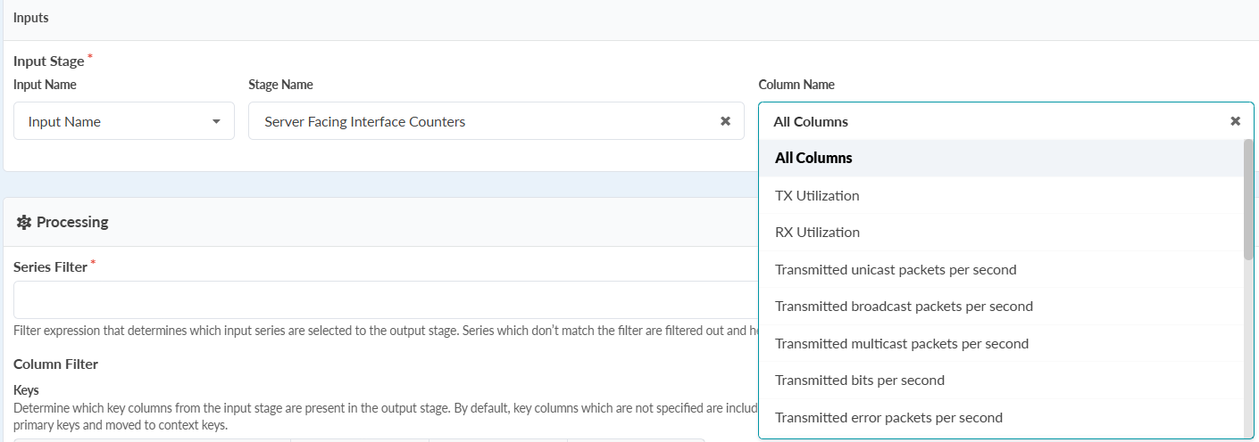 Input Stage: Choose the stage source for your processor, such as "Server Facing Interface Counters." You can choose a specific column or select "All columns" to include the entire dataset for filtering.