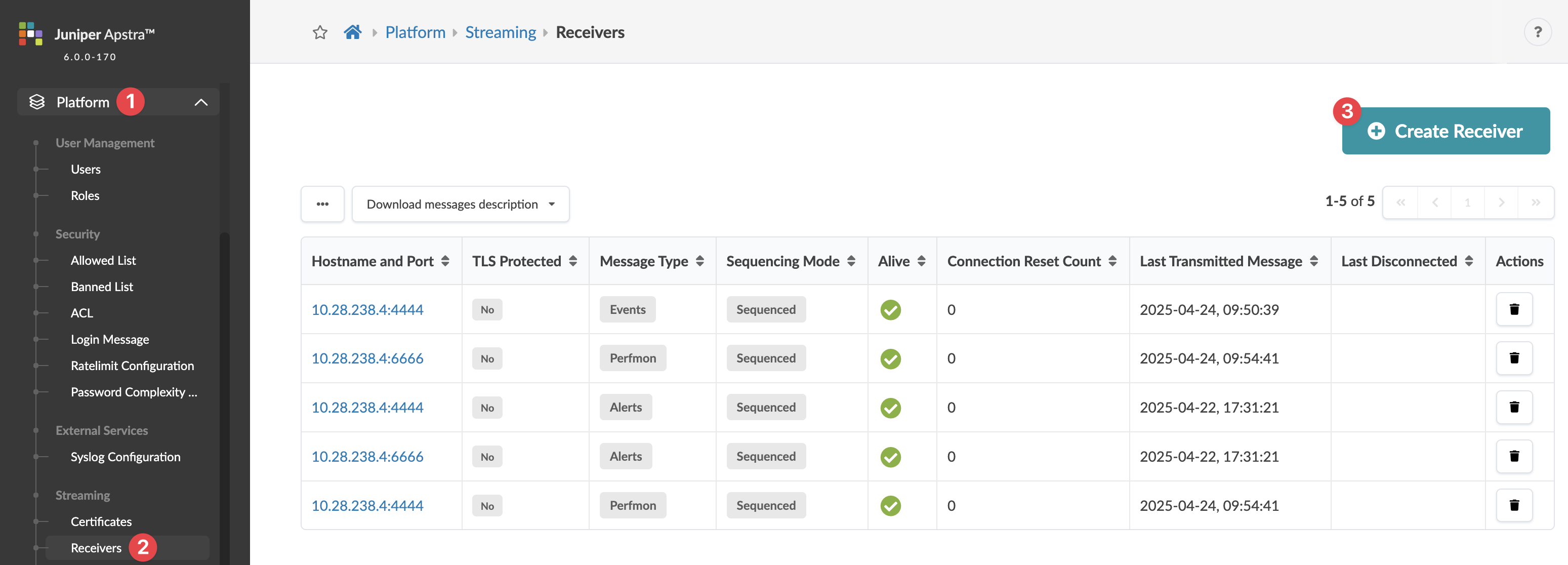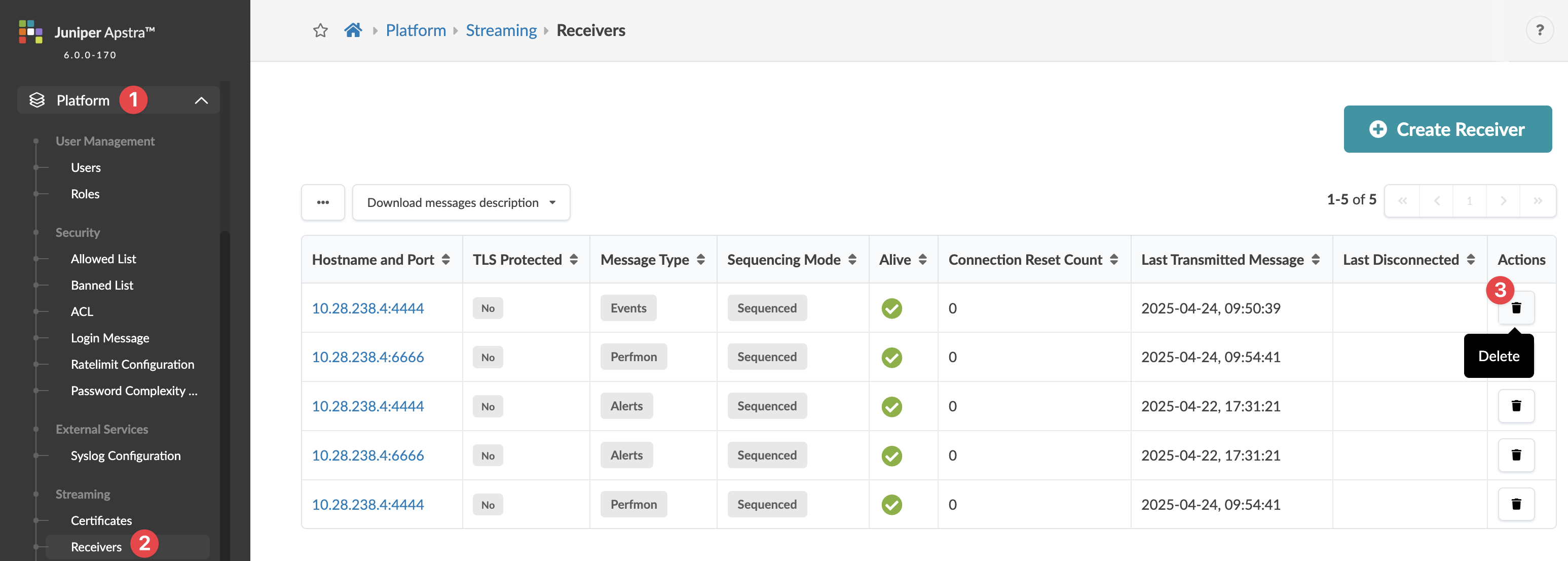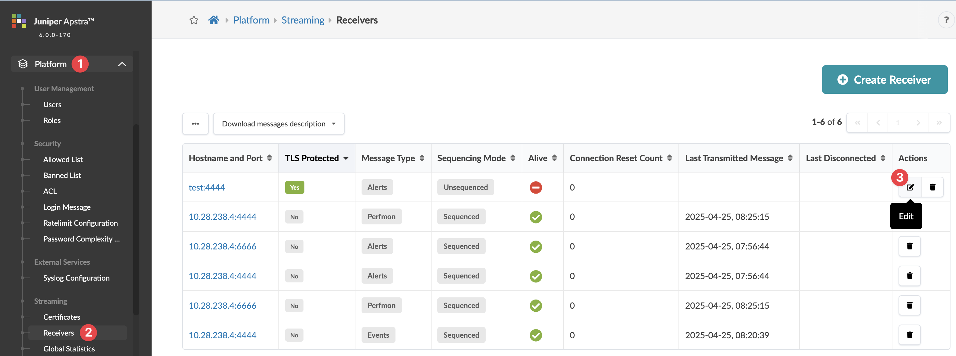 If a streaming receiver is TLS-protected and requires certificate validation, you can add and/or remove certificates.