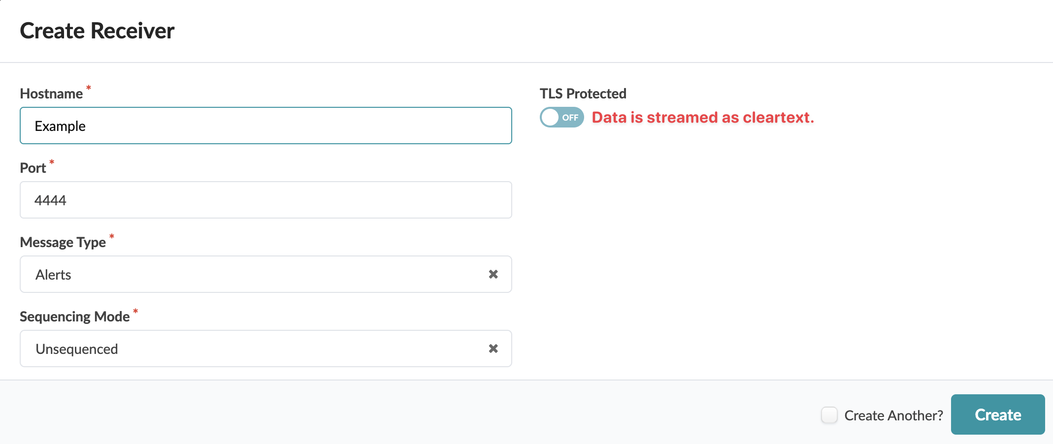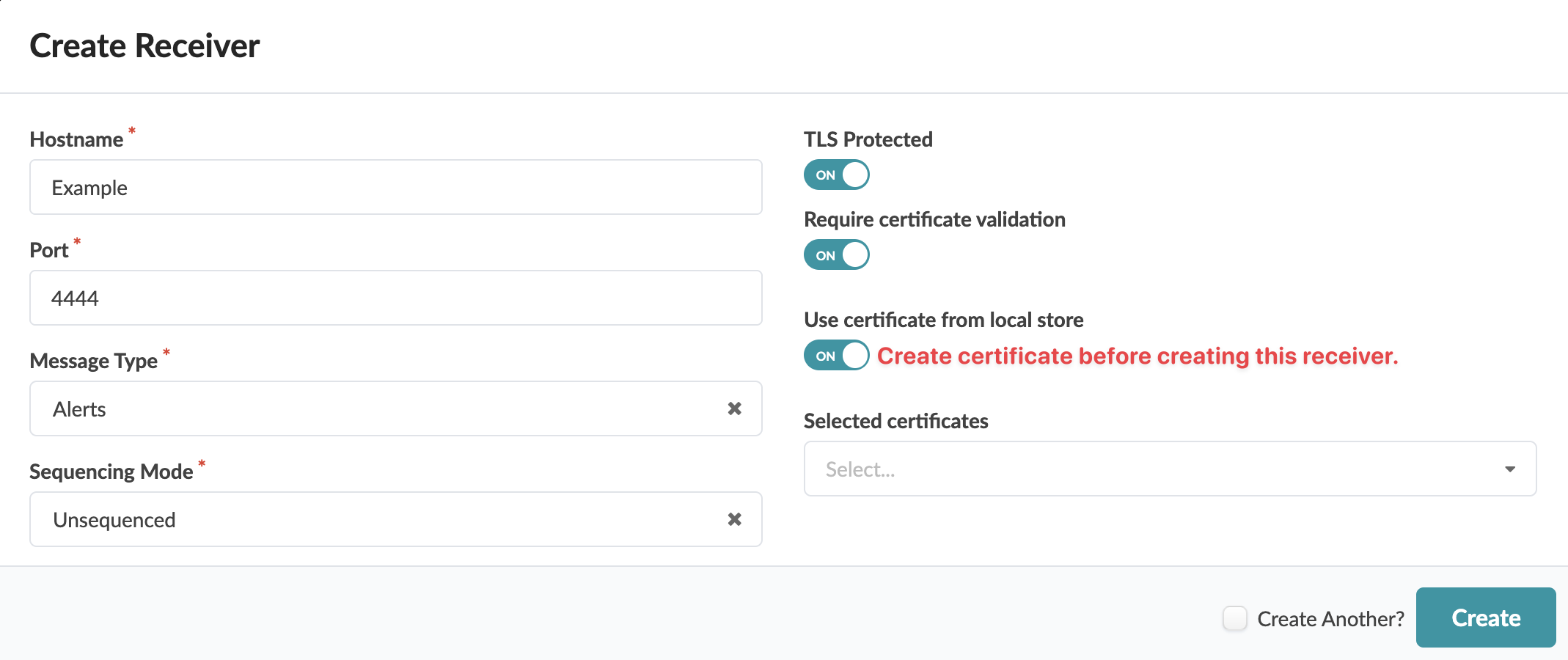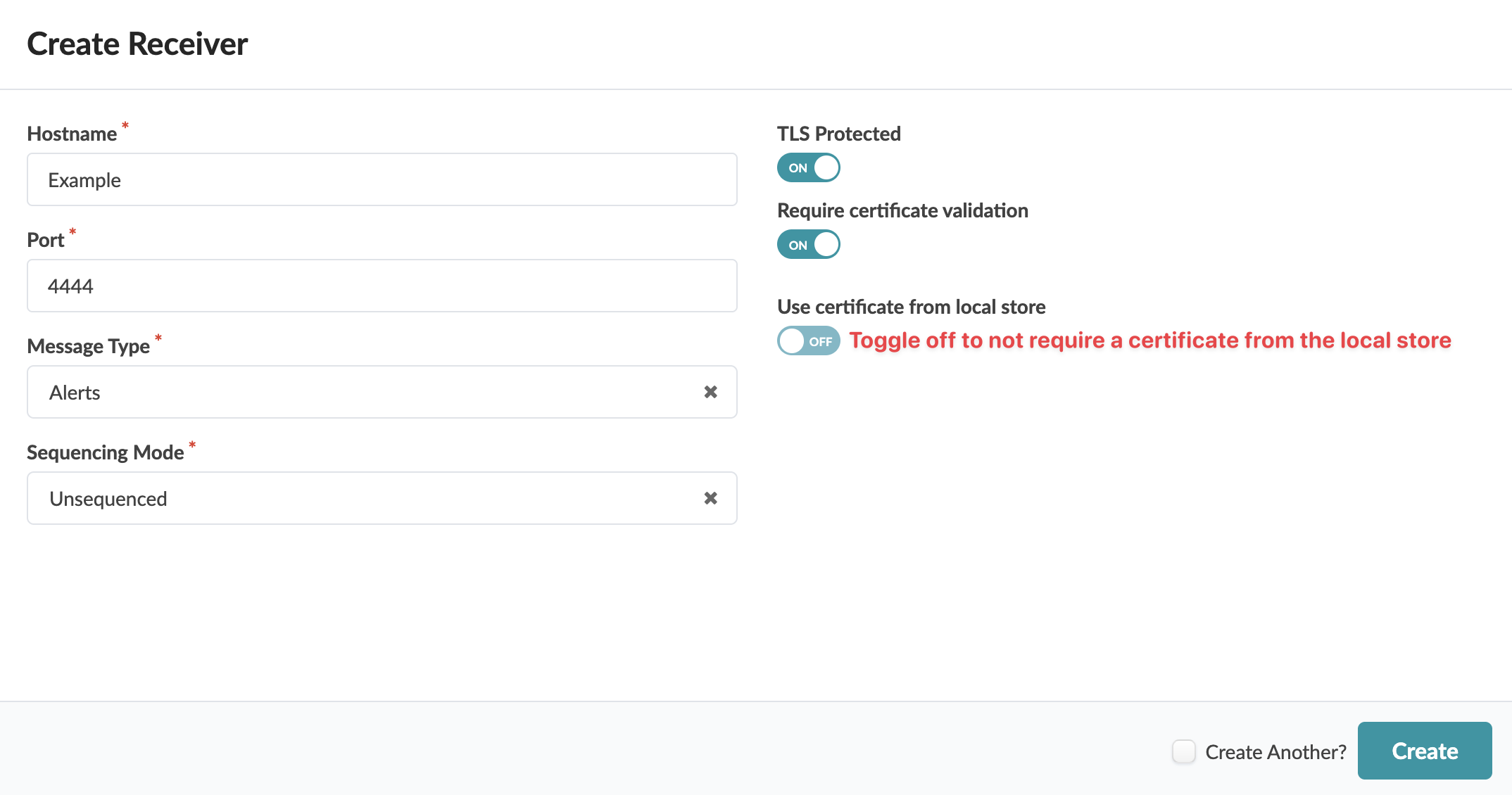 TLS protection for telemetry data streams defaults to "No" (for backward compatibility). You can optionally enable TLS protection (new in version 6.0.0), then specify whether certificate validation is required (default "YES") and whether to select certificates from a local store or to use the default system certificates. If you're using a trusted certificate from a local store it must be in the PEM format and uploaded before creating the receiver.