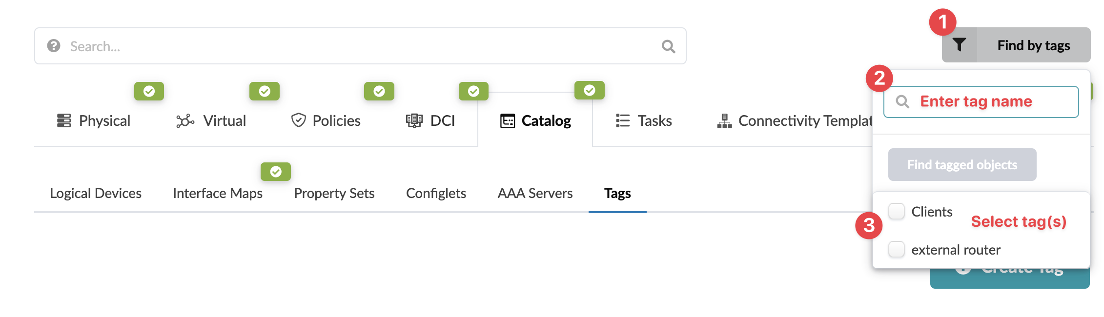 When you create a blueprint, if you added tags to the design elements used to create that blueprint (rack types and templates), those tags are added to the blueprint Tags catalog. From the blueprint, navigate to Staged > Catalog > Tags to go to the tags blueprint catalog. You can add, clone, edit and delete blueprint tags. You can also import global catalog tags to the blueprint catalog and export blueprint tags to the global catalog.