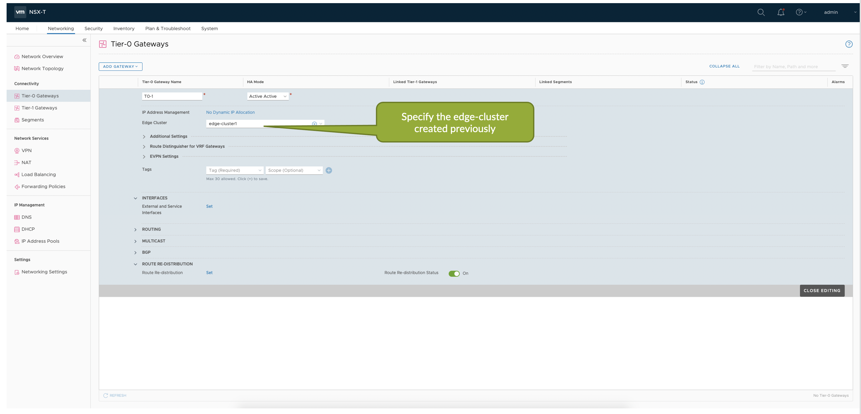 - In NSX-T Manager create the VRF-enabled Tier-0 Gateway for the tenants and add