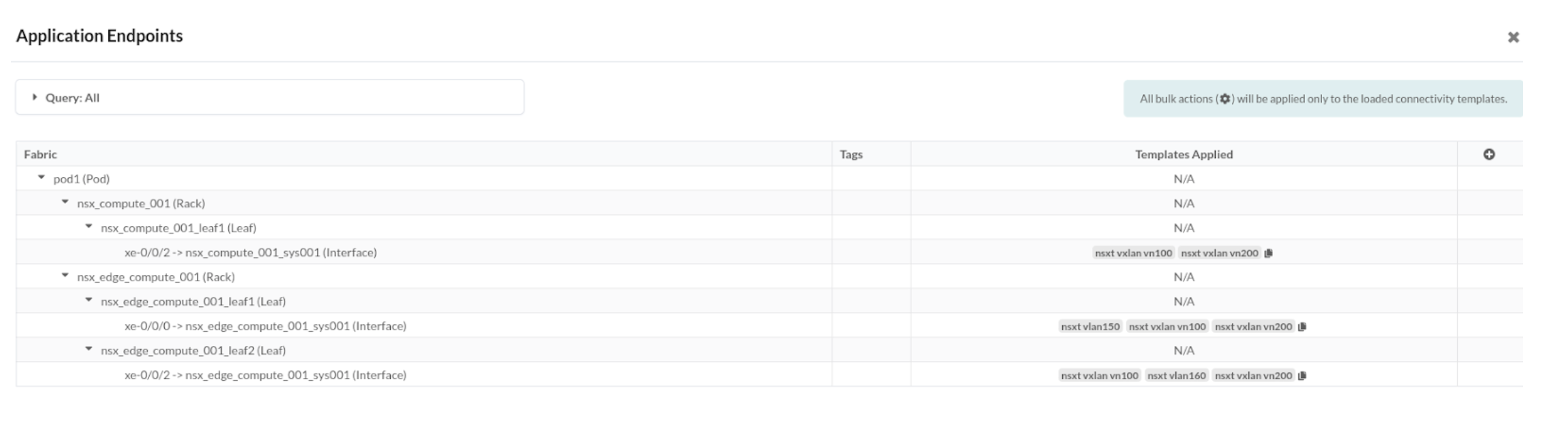 Juniper Apstra supports NSX-T Edge connectivity requirements using connectivity templates. Connectivity templates can be used both where NSX-T Edge is hosted on Bare Metal or when used as a virtual machine.