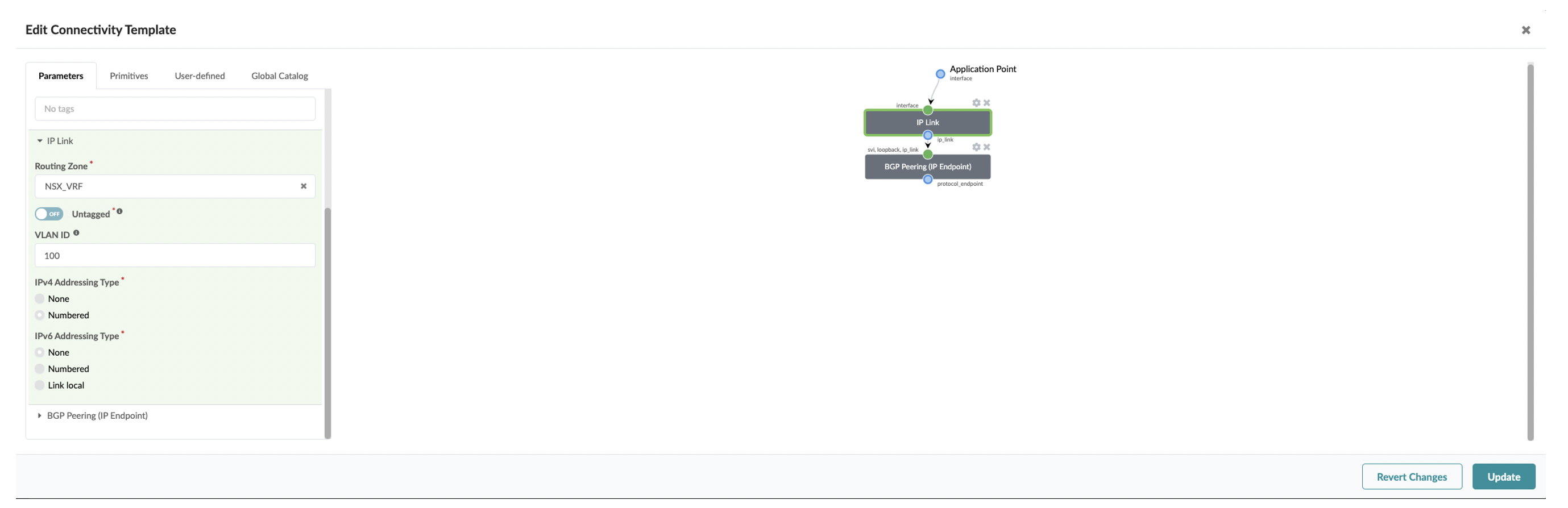 First create a Routing Zone in Juniper Apstra UI which maps to a VRF. Then need to setup IP Link Primitive based connectivity template to establish BGP peering from the NSX-T Edge node to Fabric as below: