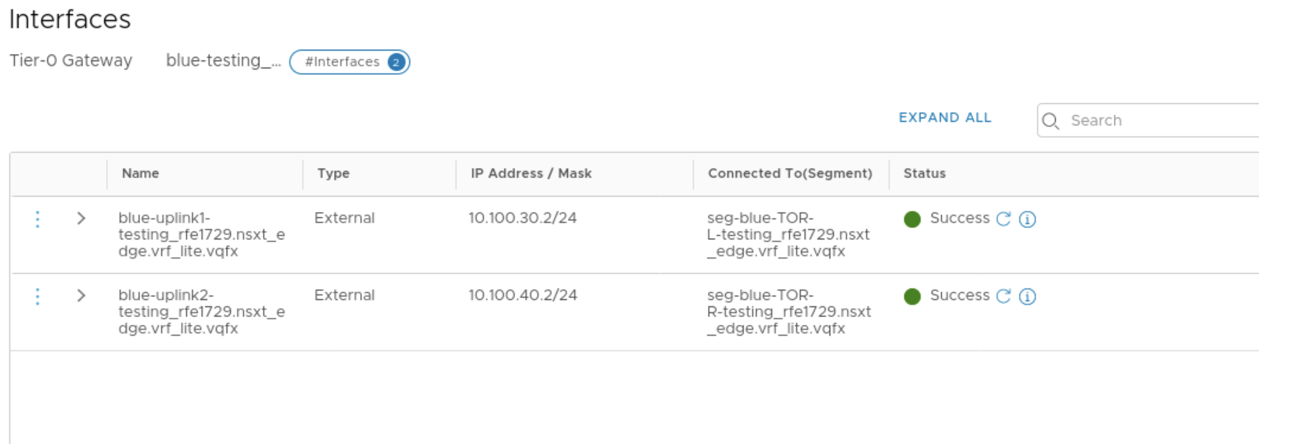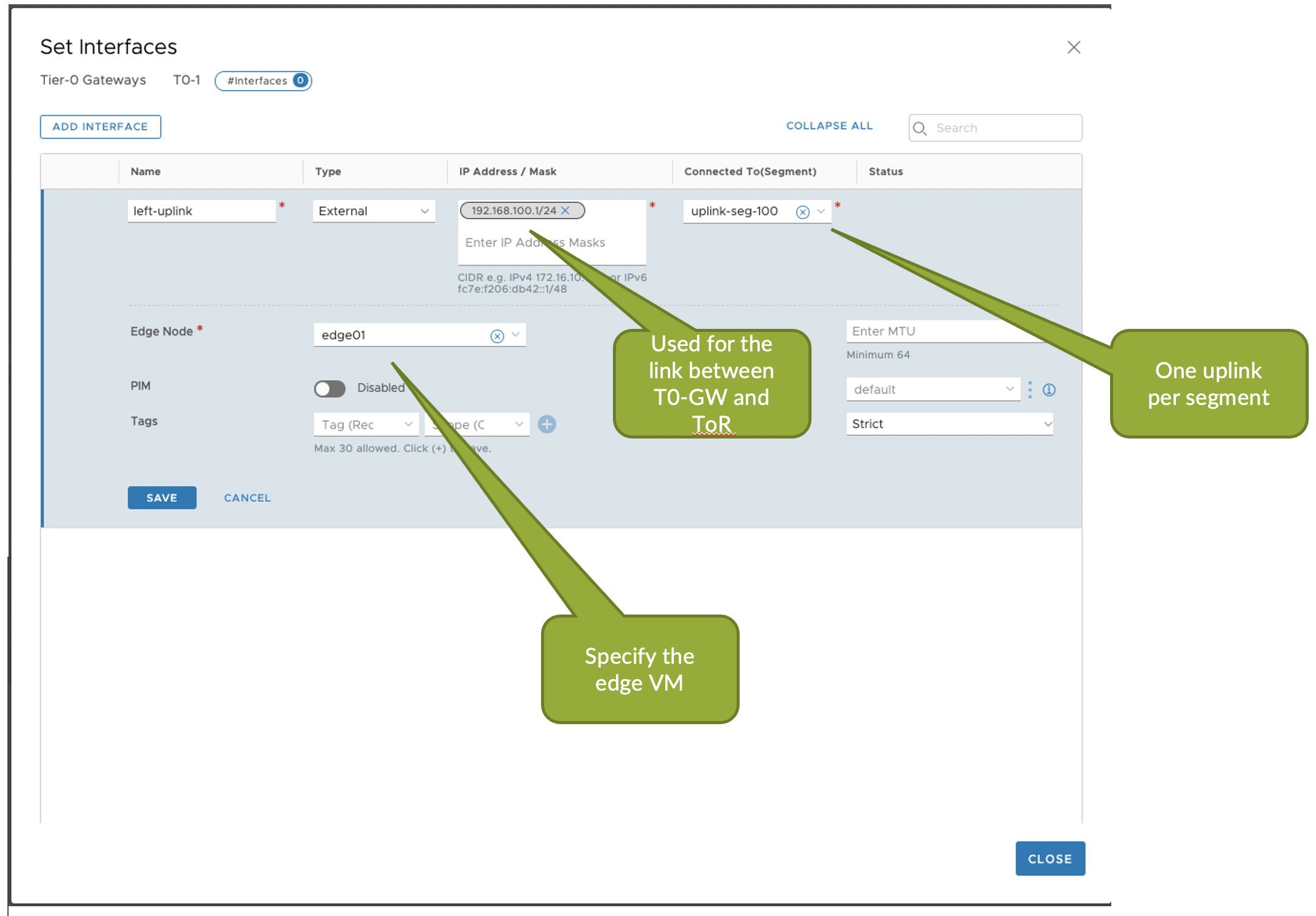 - Add External interfaces to the T0 GW which maps to the Uplink segments