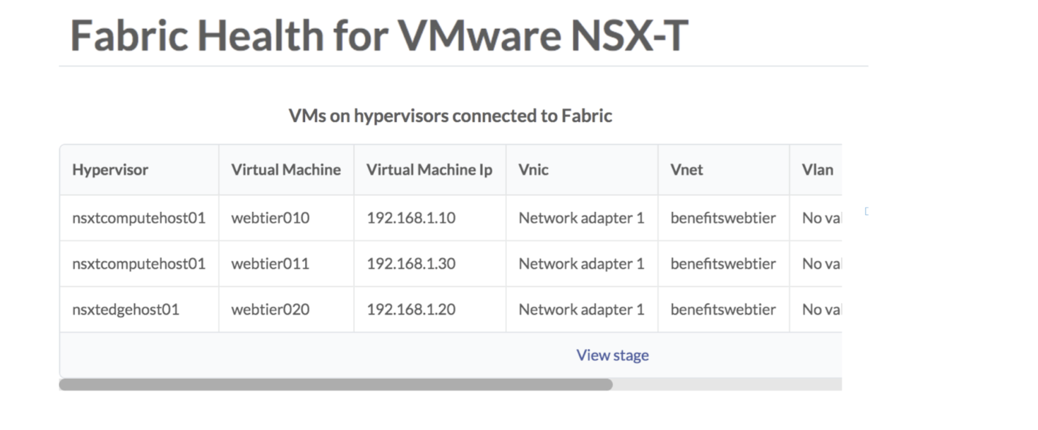 When you've successfully integrated NSX-T, you have visibility of NSX-T VMs and transport nodes in the virtual infrastructure. You can query the status of the VMware fabric health.