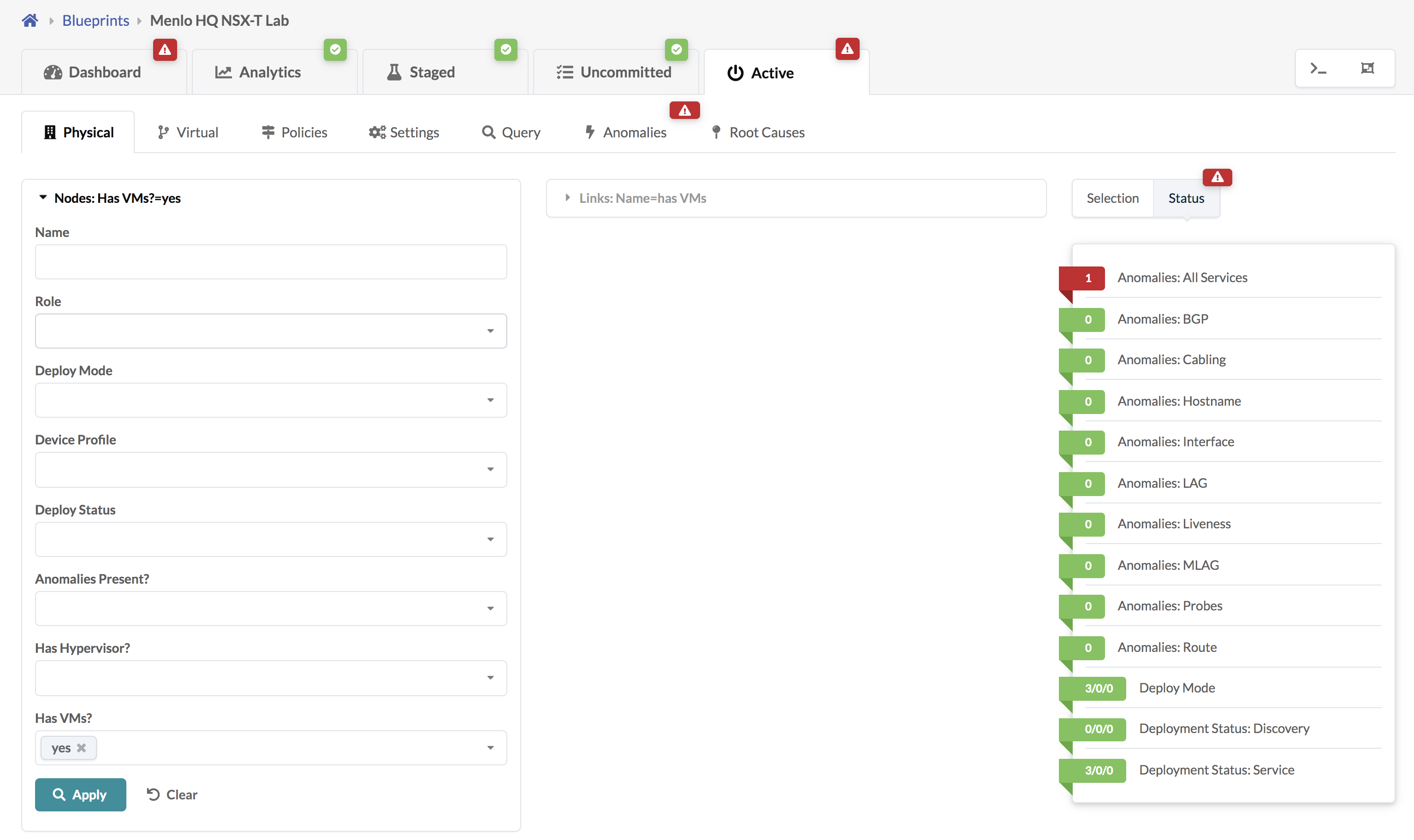 You can integrate NSX-T with Apstra software to help deploy fabric VLANs that are needed for deploying NSX-T in the data center or for providing connectivity between NSX-T overlay networks and fabric underlay networks. You can accelerate NSX-T deployments by making sure the fabric is ready in terms of LAG, MTU and VLAN configuration as per NSX-T transport node requirements. This feature also helps network operators with fabric visibility in terms of seeing all the NSX-T VMs, VM ports, and physical gateway ports. NSX-T integration helps identify issues on the fabric and on the virtual infrastructure. It eliminates manual config validation tasks between the NSX-T nodes side and the ToR switches.