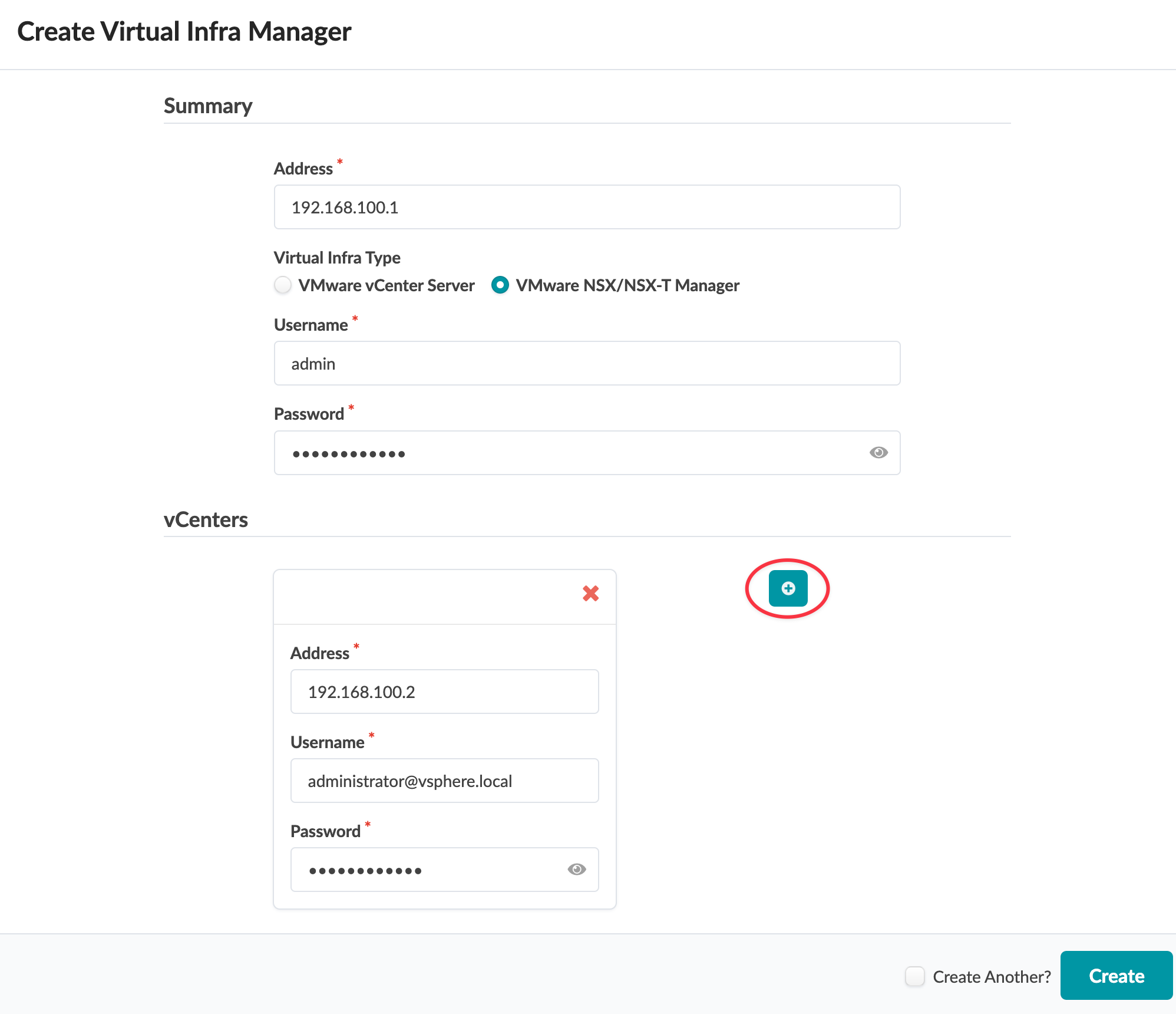 You can create Virtual Infra Managers for NSX-T Manager version 3.2.x using DVS mode. You can also add multiple Virtual Infra Managers per blueprint. This is useful when you have multiple NSX-T Managers or multiple vCenter Servers hosted in the same fabric blueprint. You'll need to provide the vCenter compute managers information (address and credentials) when you add the NSX-T Virtual Infra.