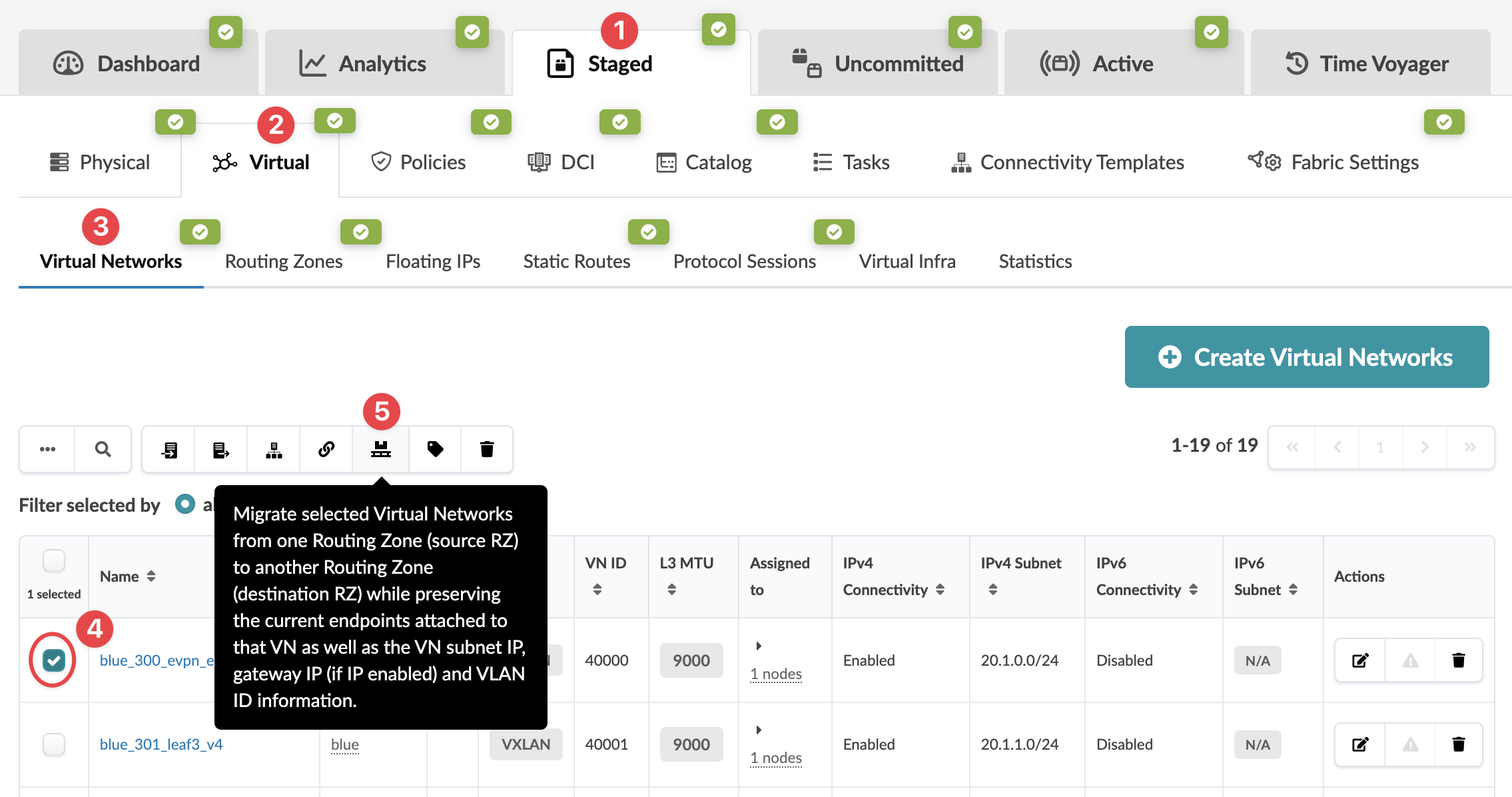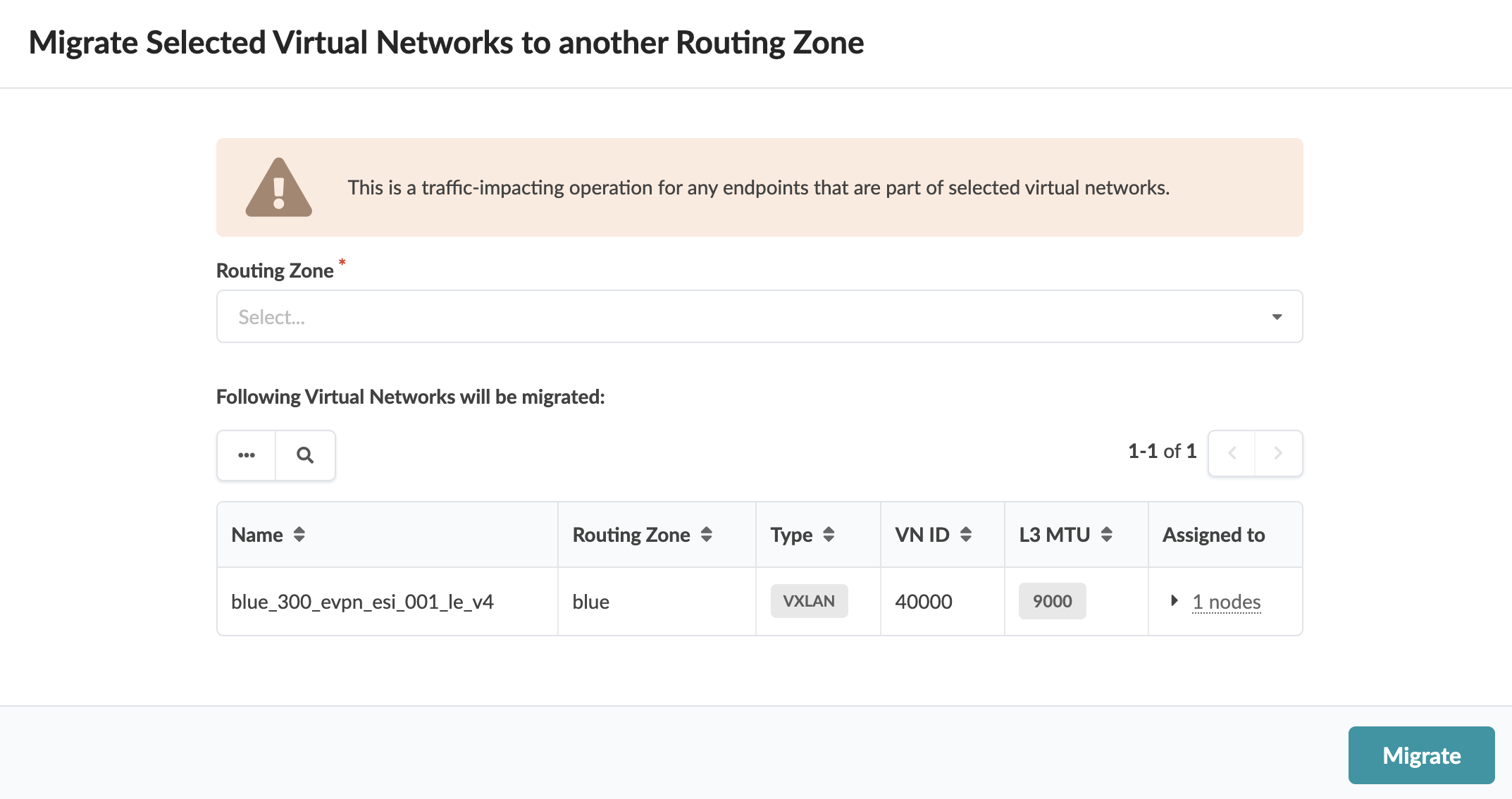 You can move one or more virtual networks from one routing zone to another (as of Apstra version 5.0.0). This is traffic-impacting for any endpoints that are part of the selected virtual networks (since the VNs need to be deleted from one RZ and recreated in the other one).