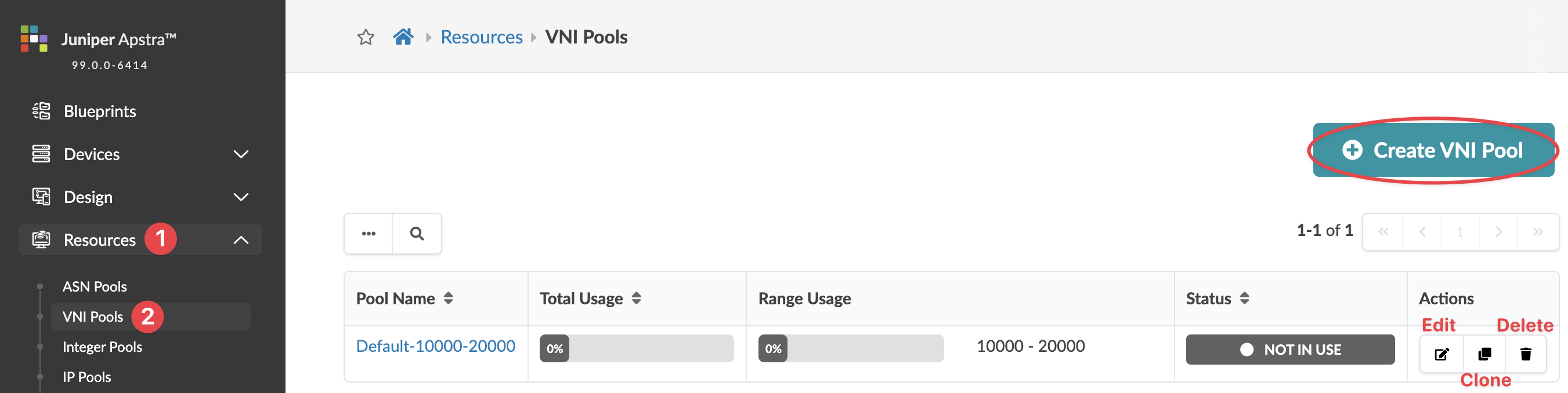 From the left navigation menu, navigate to Resources > VNI Pools to go to the VNI Pools page where you can create (clone), update and delete VNI pools.