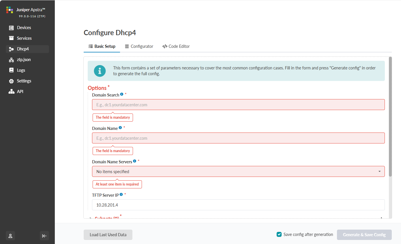 You can set up optional parameters that the DHCP services will send to every device that asks for DHCP services. You have the option of configuring these parameters at a later time via configlets. (If you define these parameters in the DHCP service, don't try to set them up again via Apstra; the device OS may return an error.)