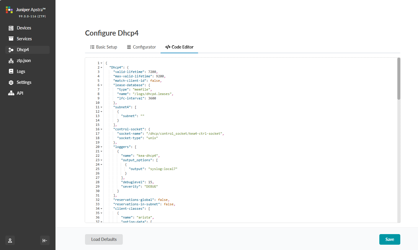 When a device connects to a network, Dynamic Host Configuration Protocol (DHCP) automatically assigns an available IP address to it. Apstra, by default, uses a Kea DHCP server for device management (as of Apstra version 5.0.0, previously it was ISC). If you set up a different DHCP server, you’re responsible for configuring the same details as described here.