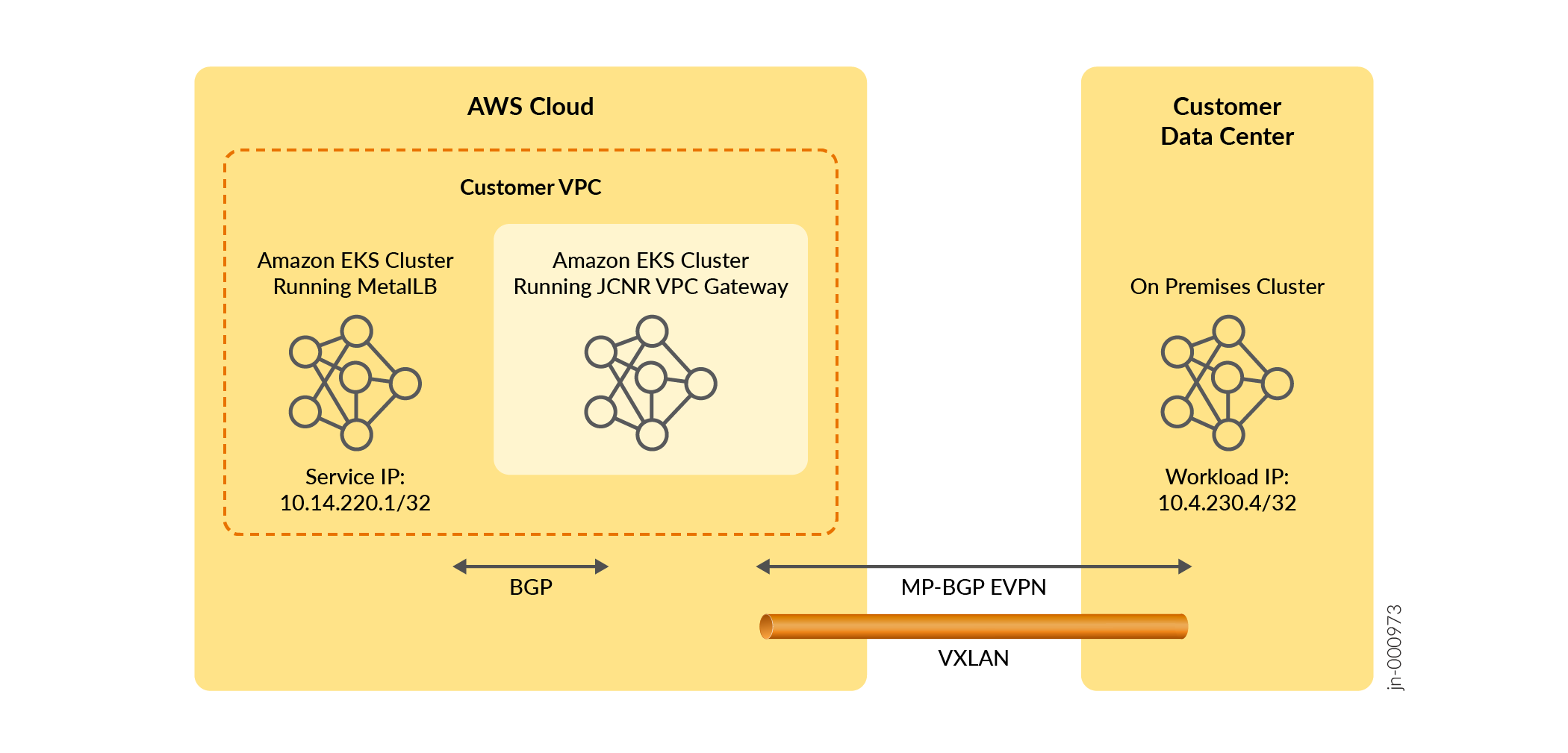 We provide the Cloud-Native Router Operator Service Module to install JCNR (with a BYOL license) on an Amazon EKS cluster and to configure it to act as an EVPN-VXLAN VPC Gateway between a separate Amazon EKS cluster running MetalLB and an on-premises Kubernetes cluster (Figure 1).