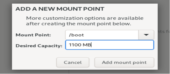 Table 1: Creating Partitions S.No. Partition Size Device Type Filesystem Label 1 /boot 1100 MB Standard Partition ext3 LABEL=/boot 2 /boot/efi or biosboot (see what shows in dropdown) 250 MB Standard Partition BIOS boot or EFI Filesystem Keep label blank 3 /tmp 10 GB Standard Partition ext3 LABEL=/tmp 4 / 10 GB Standard Partition ext3 LABEL=/ 5 /var/log 4.2 GB Standard Partition ext3 Keep label blank 6 /var 4.2 GB Standard Partition ext3 LABEL=/var 7 /var/log/audit 2.4 GB LVM ext3 LABEL=/var/log/audit 8 /home 2.4 GB Standard Partition ext3 LABEL=/home 9 /var/www 12 GB Standard Partition ext3 LABEL=/var/www 10 /var/tmp 1 GB LVM ext3 LABEL=/var/tmp 11 swap 4 GB Standard Partition swap Keep label blank -