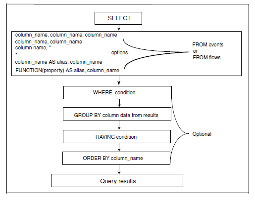 AQL queries begin with a SELECT statement to select event or flow data from the Ariel database. You can refine the data output of the SELECT statement by using the WHERE, GROUP BY, HAVING, ORDER BY, LIMIT, and LAST clauses.