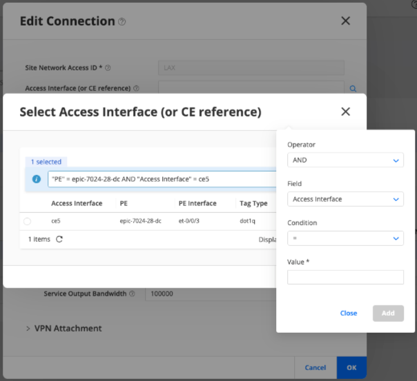 If you want to change the previously selected CE device, click the search icon (magnifying glass) next to the Access Interface (or CE reference) text box. The Search Access Interface (or CE Interface) page appears. The interfaces displayed in the table is filtered based on the selected CE device.