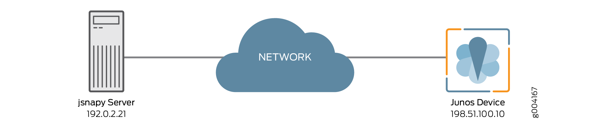This example uses a simple topology where the jsnapy server connects to a single remote Junos OS device. Connections to more than one device can be achieved but will not be discussed in this example.