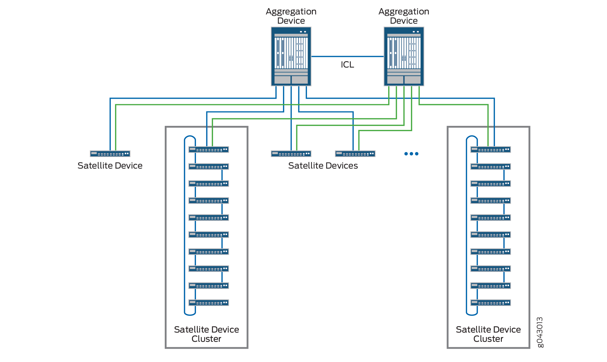 Satellite device clustering allows you to connect up to ten satellite devices into a single cluster, and connect the satellite device cluster to the aggregation device as a single group instead of as individual satellite devices.