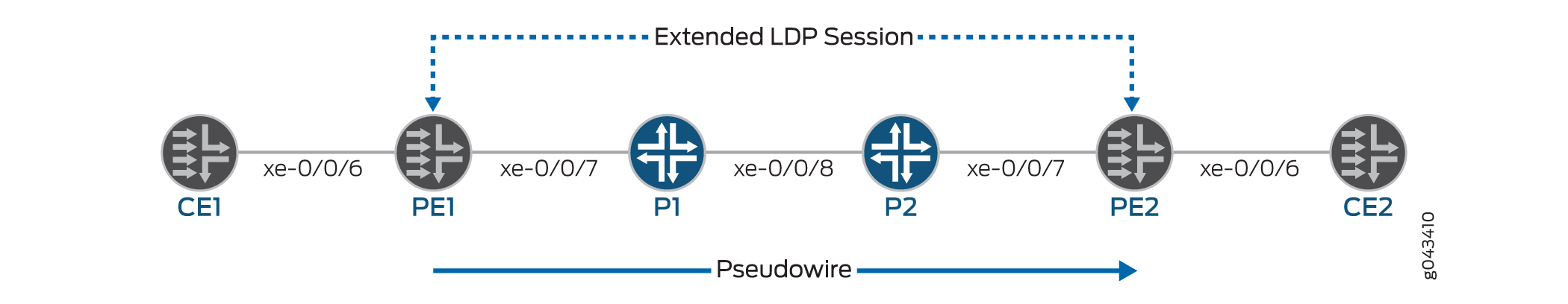 This topic refers to the local PE switch as PE1 and the remote PE switch as PE2. It also uses interface names rather than variables to help clarify the connections between the switches. The loopback addresses of the switches are configured as follows: