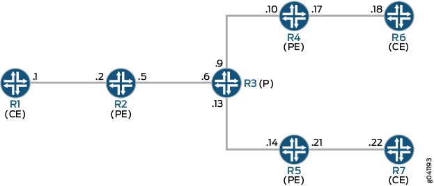 This example uses the default damping parameters and demonstrates an MBGP MVPN scenario with three provider edge (PE) routing devices, three customer edge (CE) routing devices, and one provider (P) routing device.