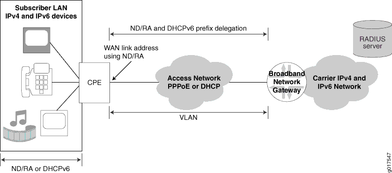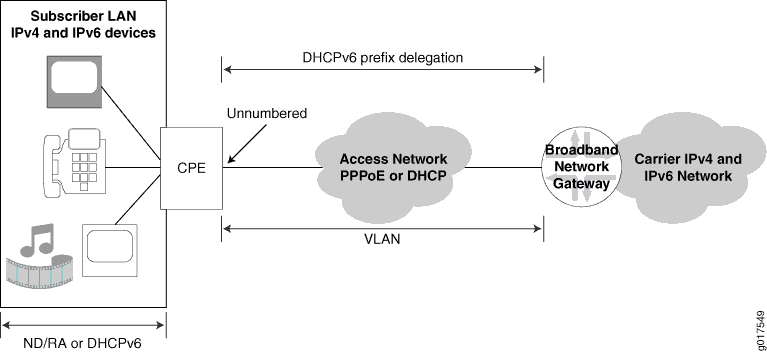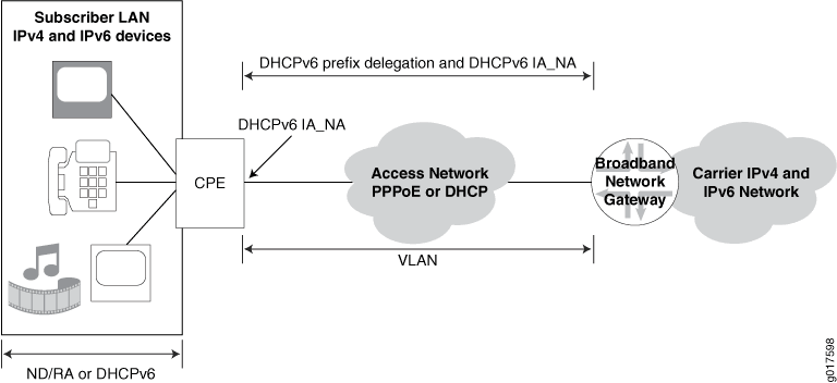 This design (Figure 1) uses DHCPv6 IA_NA and DHCPv6 prefix delegation in your subscriber access network as follows: