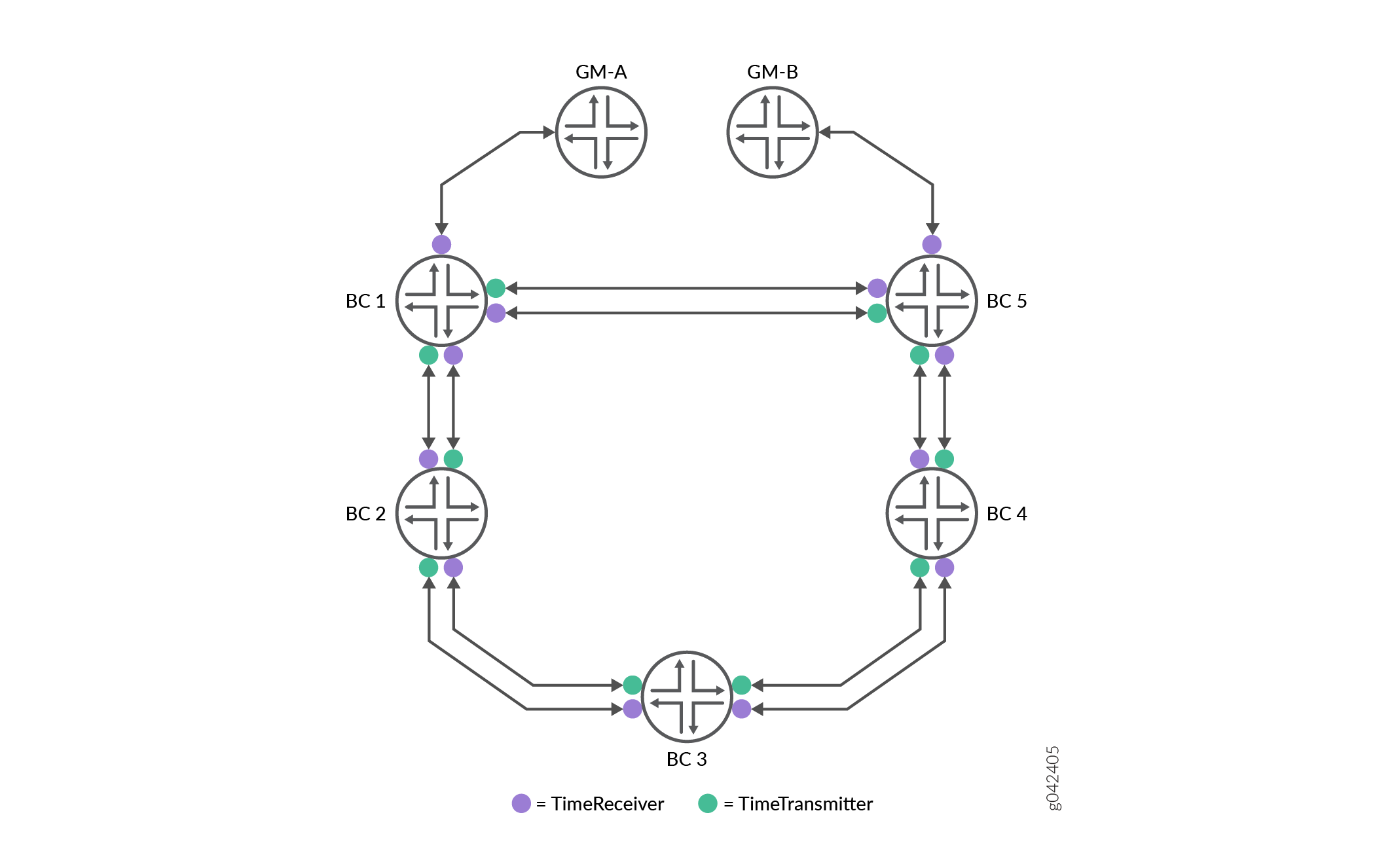 Consider a simple ring topology of boundary clocks—BC1 through BC5—driven by one primary PTP grandmaster clock and one backup PTP grandmaster clock—GM-A and GM-B, respectively—as illustrated in Figure 1. Assume that GM-A is superior to GM-B—that is, the quality level of GM-A’s clock is higher than that of GM-B’s clock.