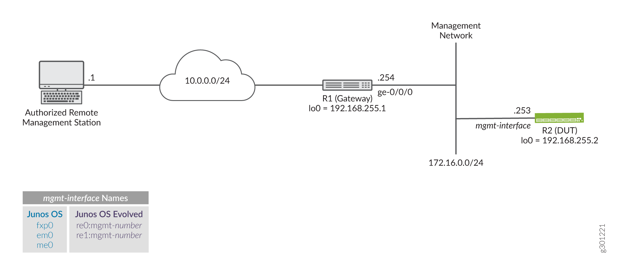 Figure 1 shows the topology for this example. The R1 device serves as the default gateway for the management network that is assigned the 172.16.0.0/24 subnet. You apply the filter that limits management access to the R2 device, making it the DUT in this example. The remote workstation is authorized to manage the DUT and has been assigned the 10.0.0.1/32 address.