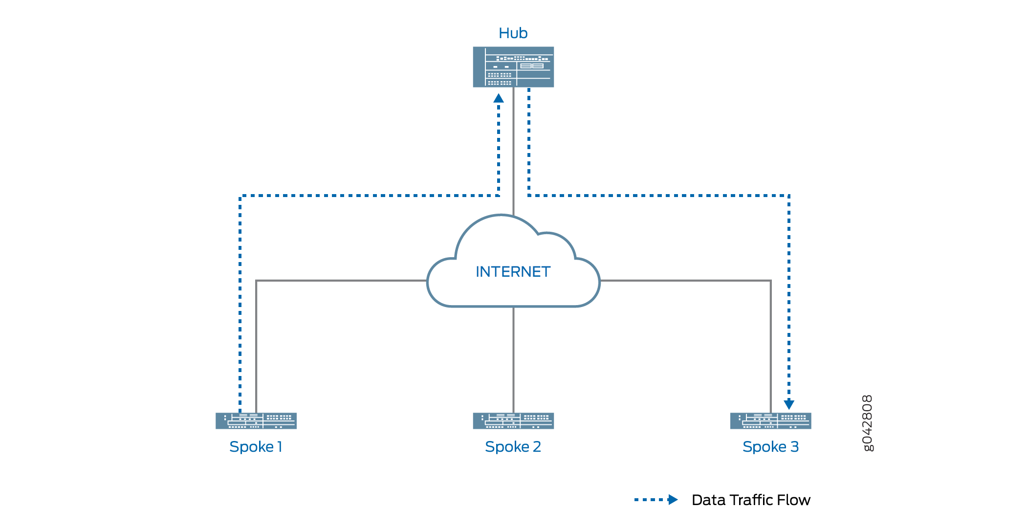 Figure 2 shows traffic passing through a shortcut between Spokes 1 and 3. Traffic from Spoke 1 to Spoke 3 does not need to traverse the Hub.