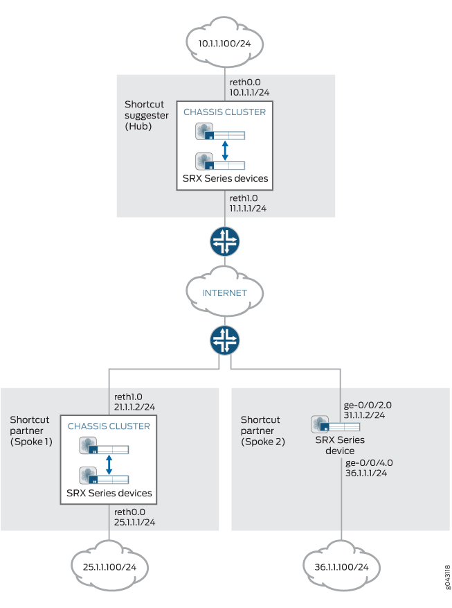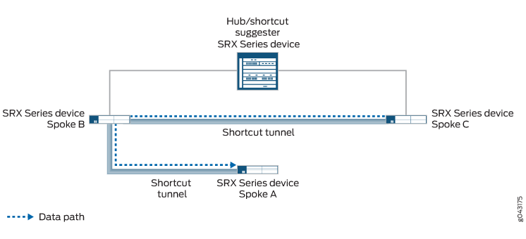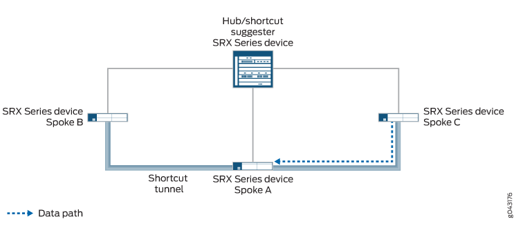 An IPsec VPN gateway can act as a shortcut suggester when it notices that traffic is exiting a tunnel with one of its peers and entering a tunnel with another peer. Figure 1 shows traffic from Spoke 1 to Spoke 3 passing through the Hub.