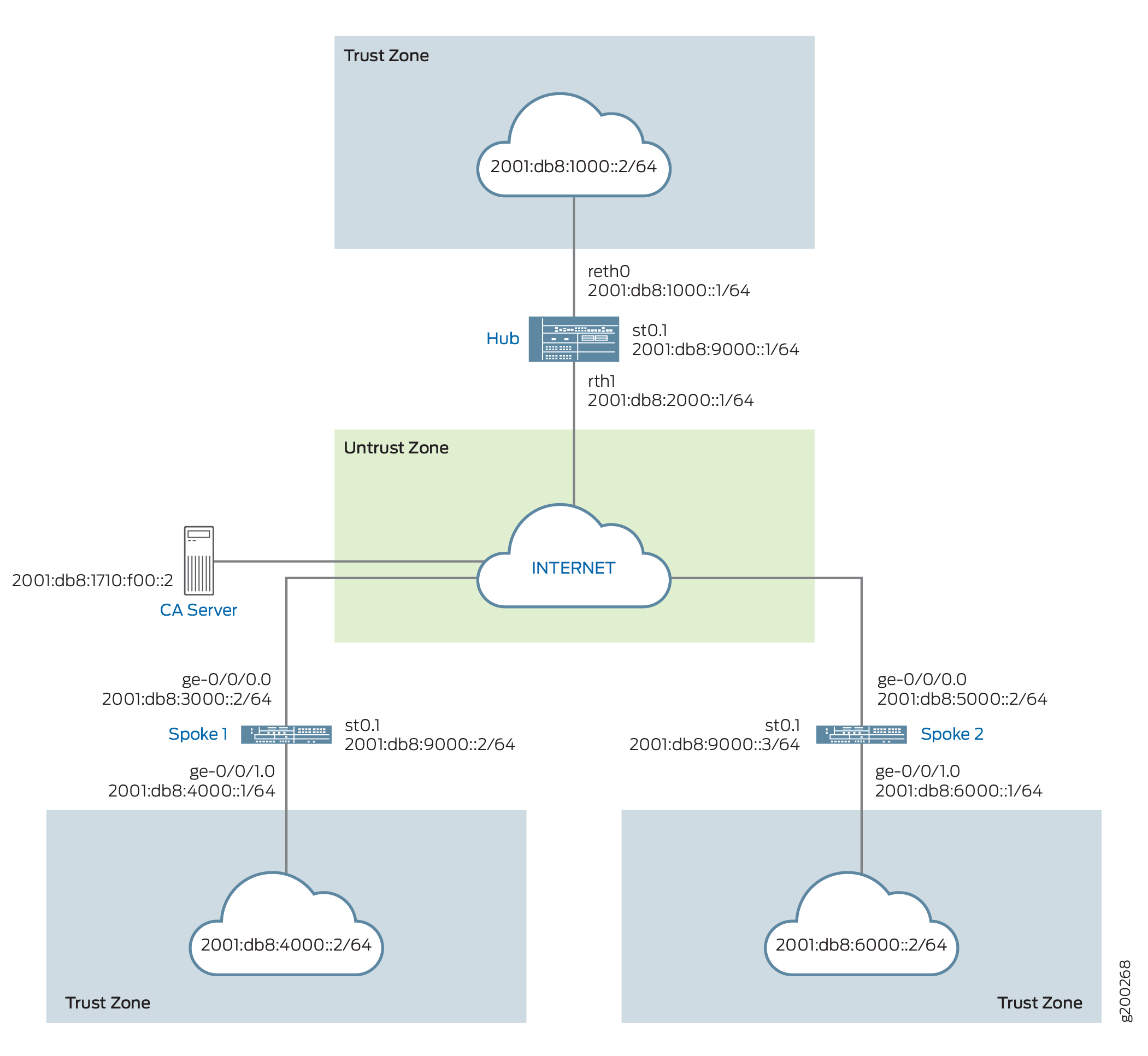 set security pki ca-profile ROOT-CA ca-identity ROOT-CA set security pki ca-profile ROOT-CA enrollment url http://2001:db8:1710:f00::2/certsrv/mscep/mscep.dll set security pki ca-profile ROOT-CA enrollment retry 5 set security pki ca-profile ROOT-CA enrollment retry-interval 0 set security pki ca-profile ROOT-CA revocation-check disable set security ike proposal IKE_PROP authentication-method rsa-signatures set security ike proposal IKE_PROP dh-group group19 set security ike proposal IKE_PROP authentication-algorithm sha-384 set security ike proposal IKE_PROP encryption-algorithm aes-256-cbc set security ike proposal IKE_PROP lifetime-seconds 6000 set security ike policy IKE_POL mode main set security ike policy IKE_POL proposals IKE_PROP set security ike policy IKE_POL certificate local-certificate SPOKE1 set security ike gateway IKE_GW_SPOKE_1 ike-policy IKE_POL set security ike gateway IKE_GW_SPOKE_1 address 2001:db8:2000::1 set security ike gateway IKE_GW_SPOKE_1 dead-peer-detection always-send set security ike gateway IKE_GW_SPOKE_1 dead-peer-detection interval 10 set security ike gateway IKE_GW_SPOKE_1 dead-peer-detection threshold 3 set security ike gateway IKE_GW_SPOKE_1 local-identity distinguished-name set security ike gateway IKE_GW_SPOKE_1 remote-identity distinguished-name container OU=SLT set security ike gateway IKE_GW_SPOKE_1 external-interface ge-0/0/0.0 set security ike gateway IKE_GW_SPOKE_1 advpn suggester disable set security ike gateway IKE_GW_SPOKE_1 version v2-only set security ipsec proposal IPSEC_PROP protocol esp set security ipsec proposal IPSEC_PROP encryption-algorithm aes-256-gcm set security ipsec proposal IPSEC_PROP lifetime-seconds 3000 set security ipsec policy IPSEC_POL perfect-forward-secrecy keys group19 set security ipsec policy IPSEC_POL proposals IPSEC_PROP set security ipsec vpn IPSEC_VPN_SPOKE_1 bind-interface st0.1 set security ipsec vpn IPSEC_VPN_SPOKE_1 ike gateway IKE_GW_SPOKE_1 set security ipsec vpn IPSEC_VPN_SPOKE_1 ike ipsec-policy IPSEC_POL set security ipsec vpn IPSEC_VPN_SPOKE_1 establish-tunnels immediately set security policies default-policy permit-all set security zones security-zone trust host-inbound-traffic system-services all set security zones security-zone trust host-inbound-traffic protocols ospf3 set security zones security-zone trust interfaces ge-0/0/1.0 set security zones security-zone untrust host-inbound-traffic system-services all set security zones security-zone untrust host-inbound-traffic protocols ospf3 set security zones security-zone untrust interfaces st0.1 set security zones security-zone untrust interfaces ge-0/0/0.0 set interfaces ge-0/0/0 unit 0 family inet6 address 2001:db8:3000::2/64 set interfaces ge-0/0/1 unit 0 family inet6 address 2001:db8:4000::1/64 set interfaces st0 unit 1 multipoint set interfaces st0 unit 1 family inet6 address 2001:db8:9000::2/64 set routing-options rib inet6.0 static route 2001:db8:2000::0/64 next-hop 2001:db8:3000::1 set protocols ospf3 area 0.0.0.0 interface ge-0/0/1.0 set protocols ospf3 area 0.0.0.0 interface st0.1 interface-type p2mp set protocols ospf3 area 0.0.0.0 interface st0.1 dynamic-neighbors