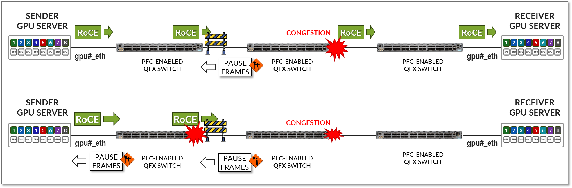 While PFC mitigates data loss and allows the receiver to catch up on processing packets already in the queue, it impacts the performance of applications using the affected queues during the congestion period. Additionally, resuming traffic transmission of post-congestion often triggers a surge, potentially exacerbating or reinstating the congestion scenario.