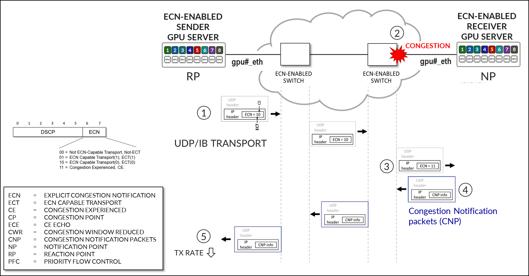 - The receiving NIC, or Notification Point (NP), which transmits CNPs when receiving ECN-marked packets