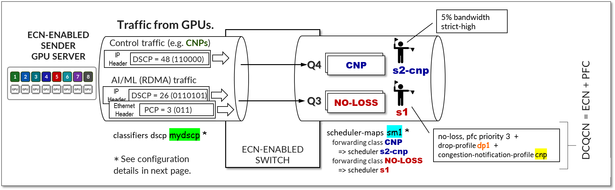 RDMA traffic must be properly marked to allow the switch to correctly classify it, and to place it in the lossless queue for proper treatment. Marking can be either DSCP within the IP header, or PCP in the ethernet frame vlan-tag field. Whether DSCP or PCP is used depends on whether the interface between the GPU server and the switch is doing vlan tagging (802.1q) or not. Figure 25 shows how RDMA and CNP are marked differently, and as a result, the fabric switch classified and schedules the two types of packets differently.
