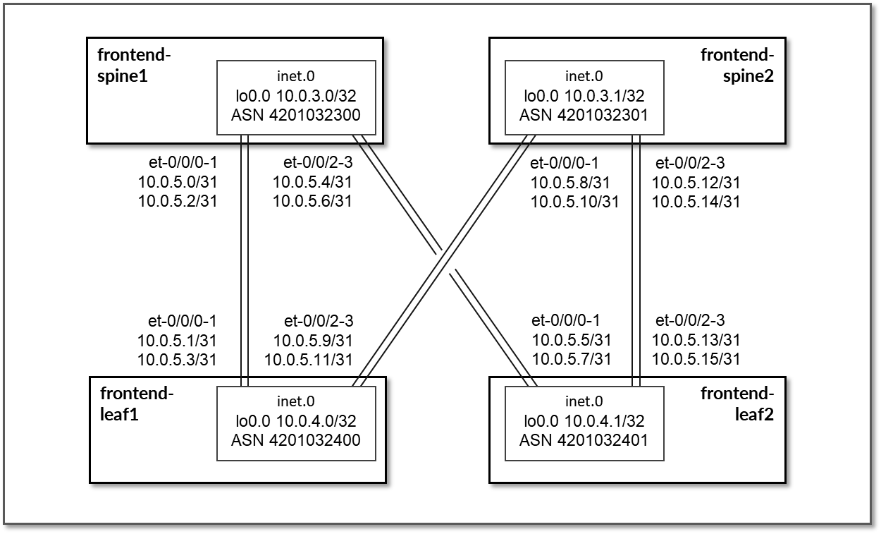EBGP is configured between the IP addresses assigned to the spine-leaf links. There are two EBGP sessions between each frontend-leaf# node and each frontend-spine#