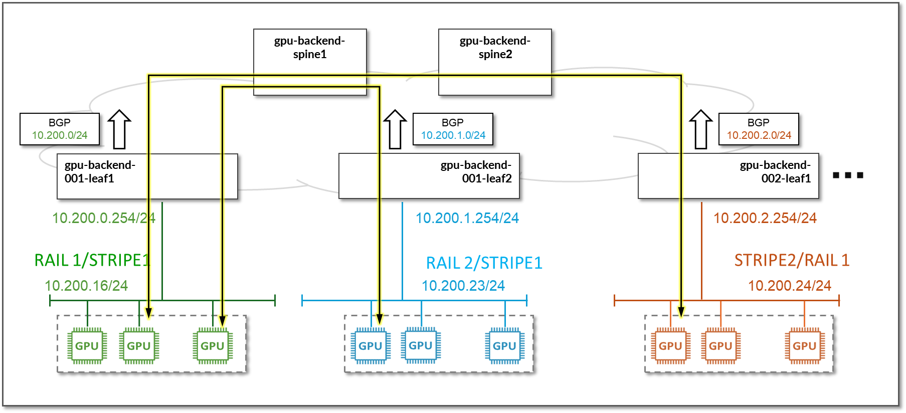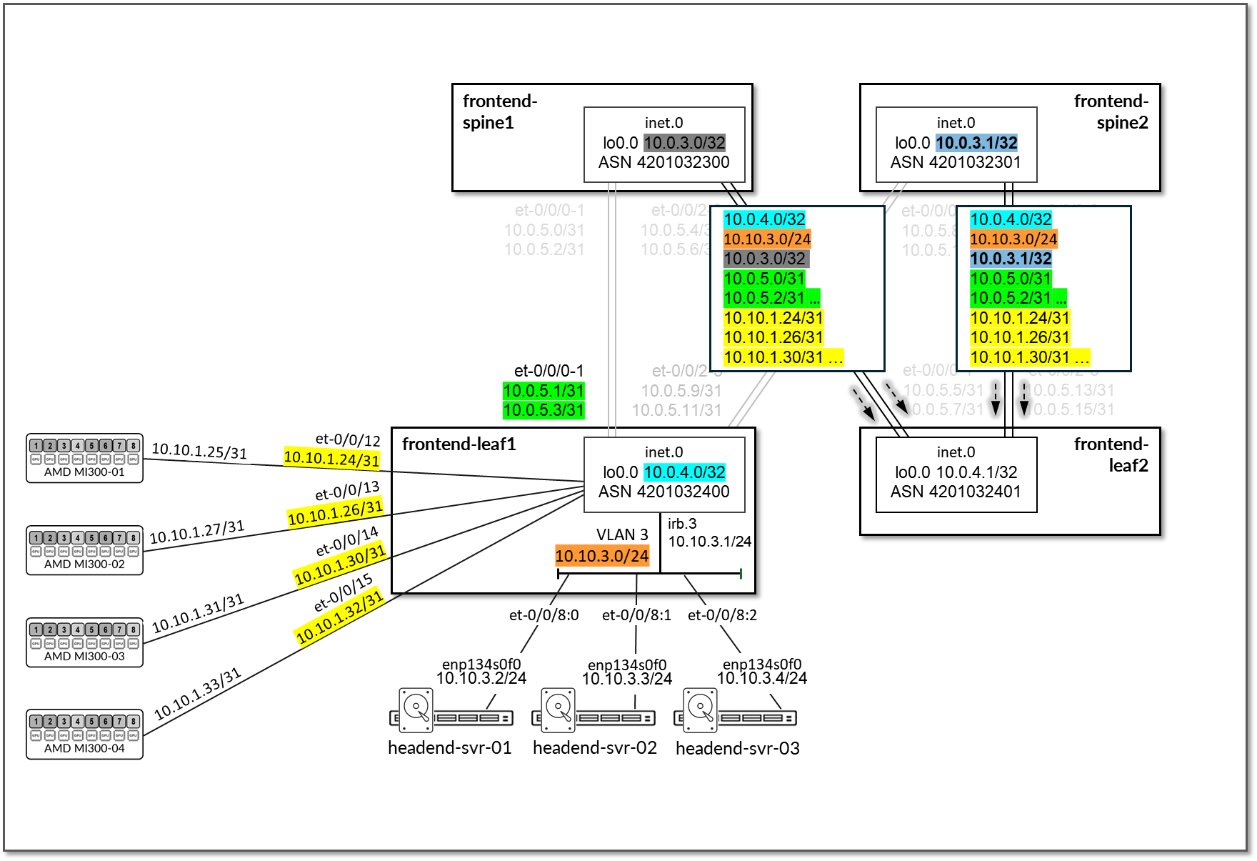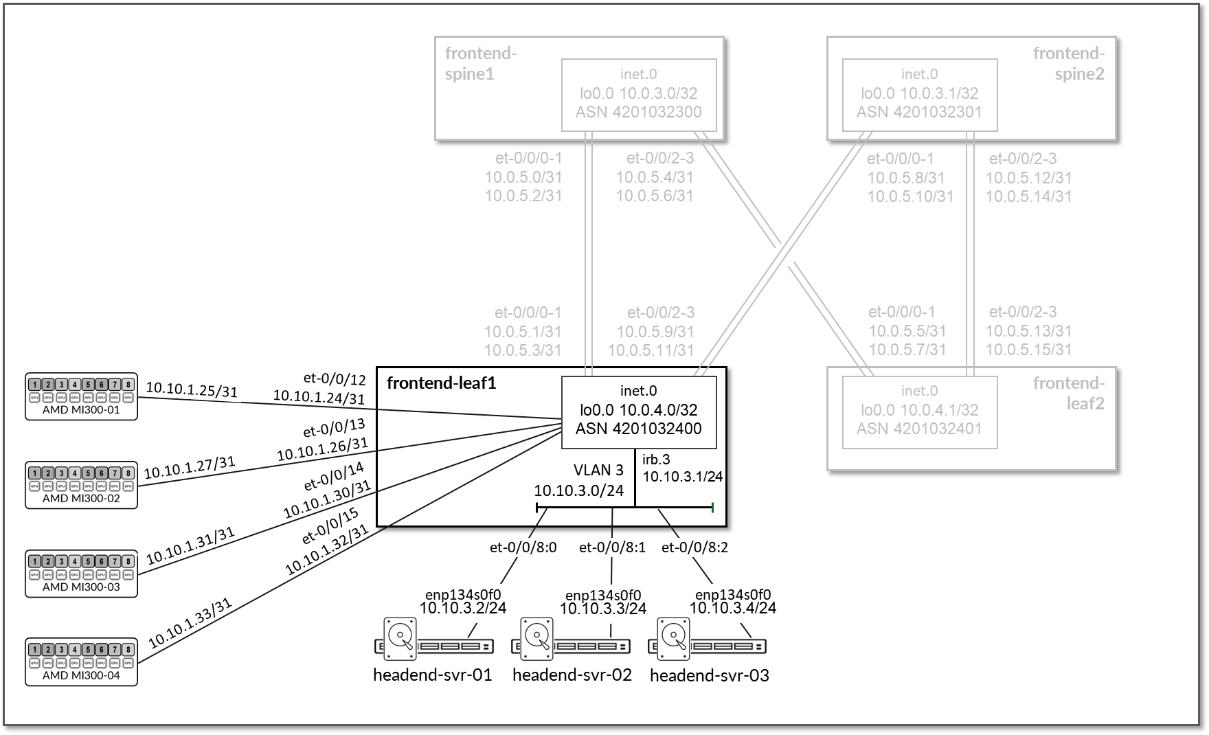 GPU servers <=> frontend spine links:10.10.1.24/31 10.10.1.26/31 10.10.1.30/31 10.10.1.32/31 Headend servers’ subnet: 10.10.3.0/24 |