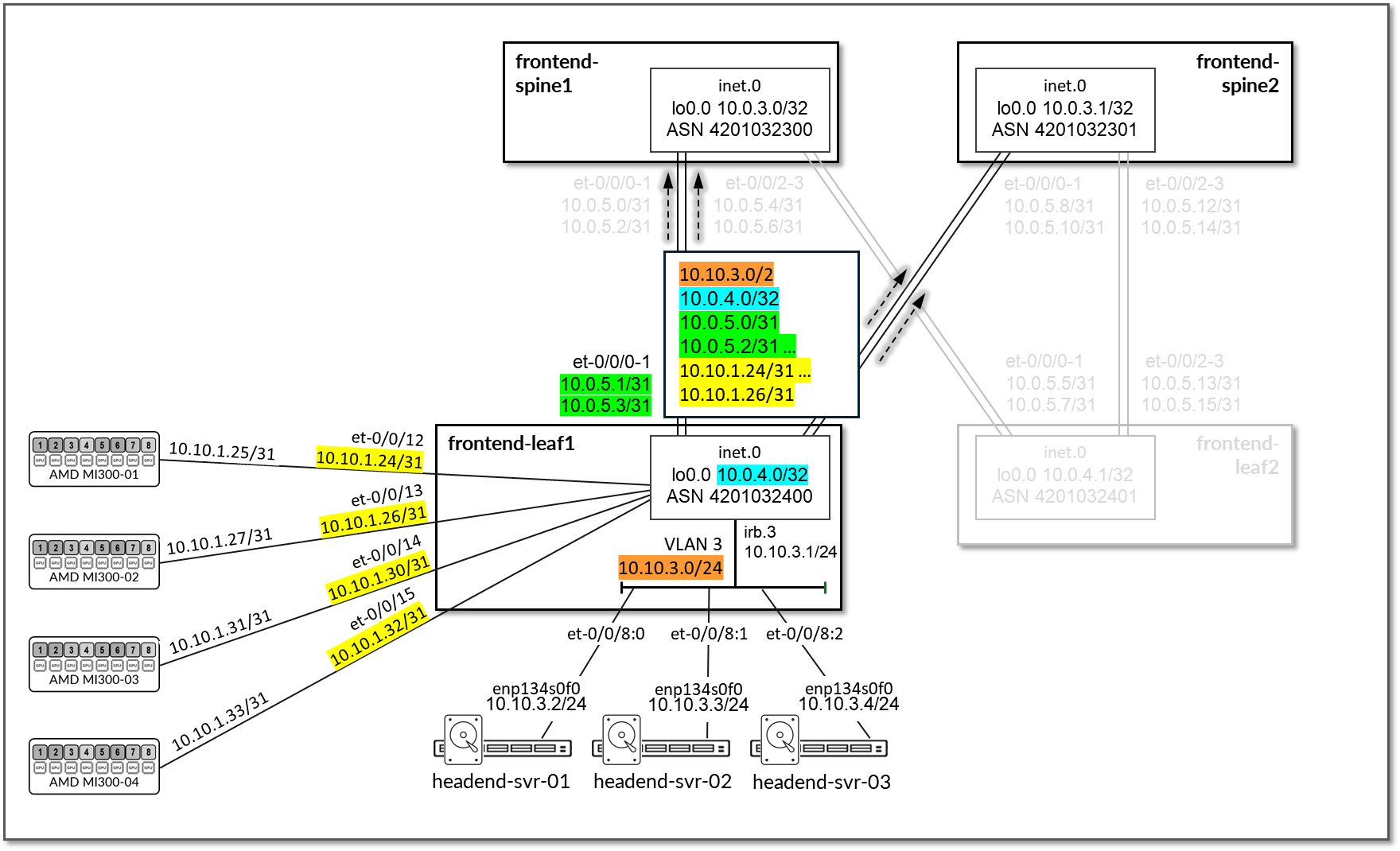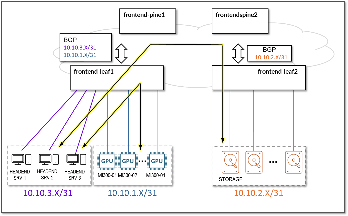 Advertising these subnets has the goal of allowing communication between the headend servers and the MI300X GPU server for AI job orchestration and monitoring, and between the headend servers and the storage devices connected to frontend-leaf2. Communication between the headend servers and storage devices is not discussed further in this document. Remember that the Vast storage devices are not connected to the frontend fabric.