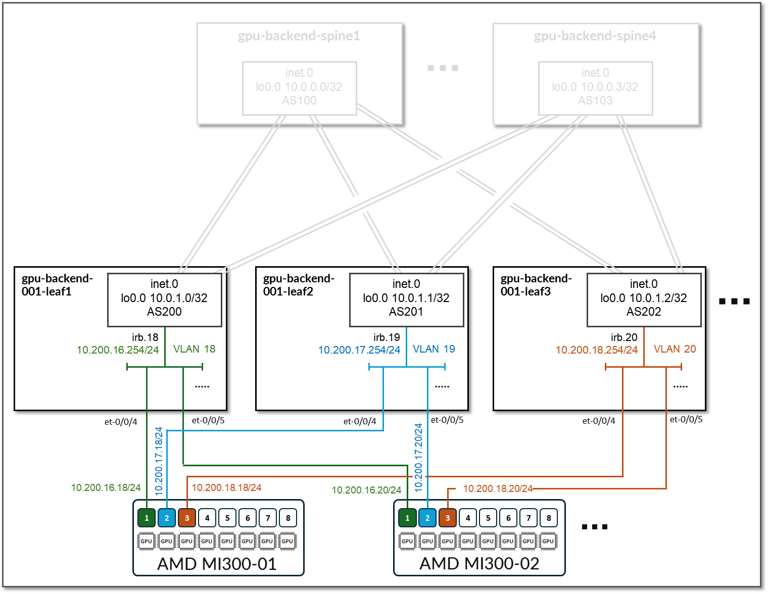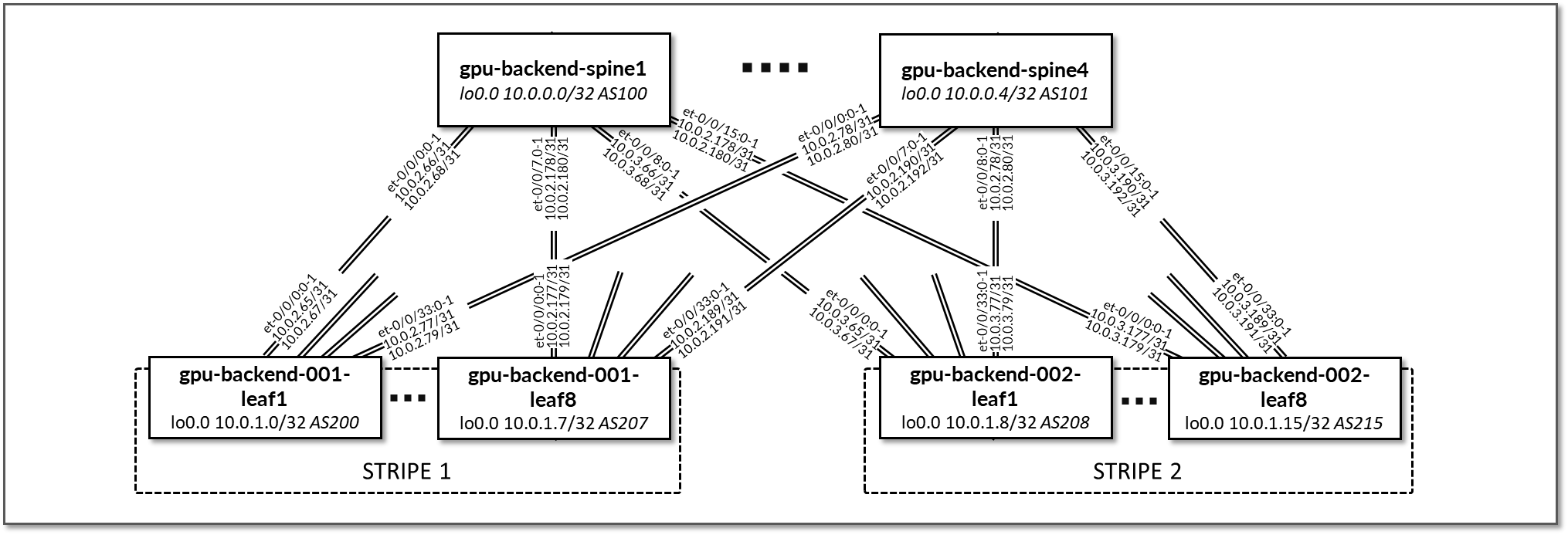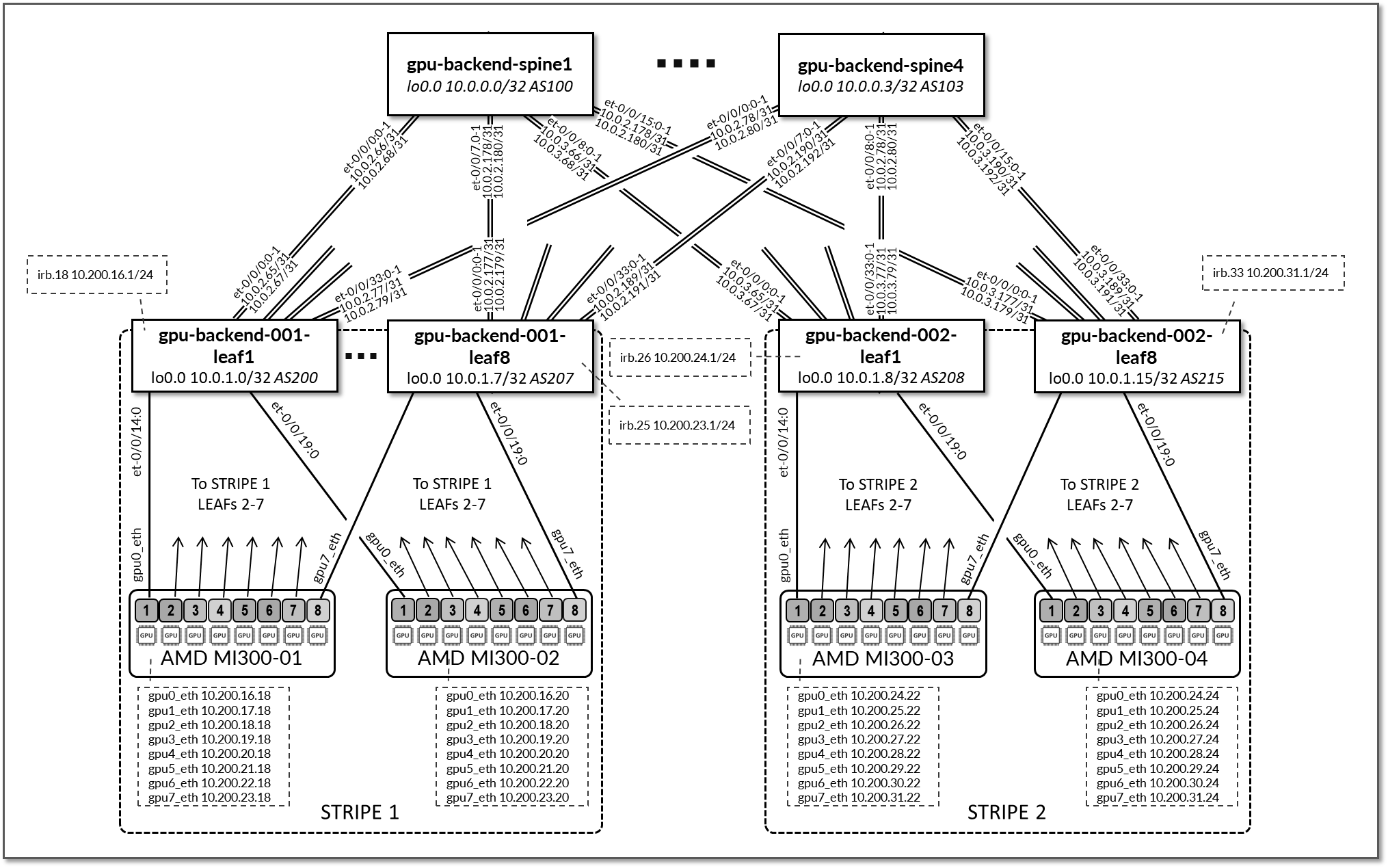The GPU backend fabric consists of four spine nodes (QFX5230-64CD) and eight leaf nodes (QFX5230-64CD) per stripe. Two AMD MI300X GPU servers are connected to each stripe, following the rail-optimized architecture described earlier in this document.